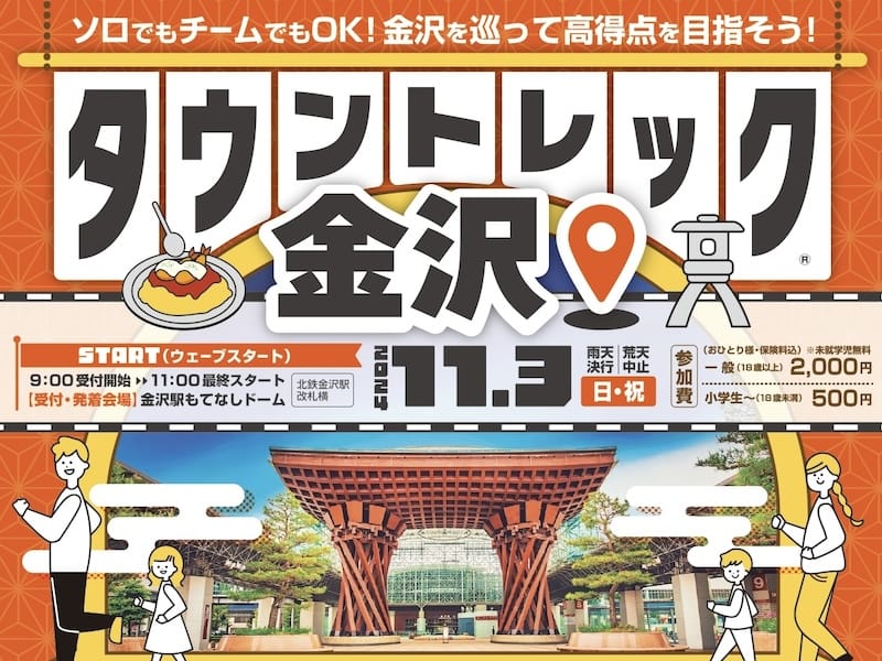 「タウントレック」とは、Town(街)を Trek(移動する)を組み合わせた、体験型街巡りイベント。参加者は配布された地図を基に、制限時間内に各チェックポイントを回り、ポイントを集める。単なる街巡りではなく、チェックポイントへの道順を決めたりポイントで撮影や体験をしたり、その途中も楽しみながら街探検できるのが特徴。主催の「タウントレック協会北陸支部」様よりイベントを魅力的に、そして若い世代に知っていただけるような施策立案を金沢日和に相談をいただきました。