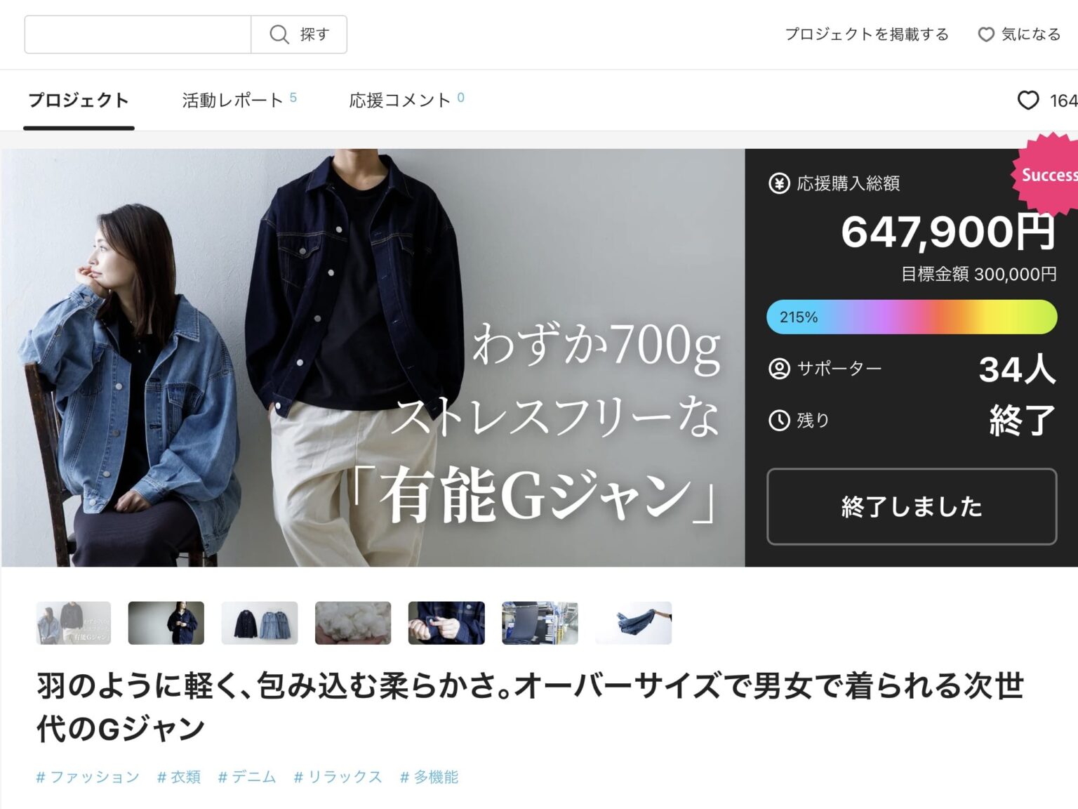 商品の魅力を訴求するため、モデルの選定や写真撮影に特に注意を払い、ターゲット層に向けて好感度の高い、おしゃれなビジュアルを制作しました。技術力を根拠としたGジャンの長所をしっかりと理解してもらうため、検証データなども盛り込み、丁寧に魅力を伝えることに注力。その結果、早々に目標金額の300,000円を達成し、最終的には目標の2倍を超える647,900円を集める成功を収めました。ちょうど、自社ECサイトの商品撮影が必要なタイミングだったため、EC用のモデル着用・商品撮影も承りました。