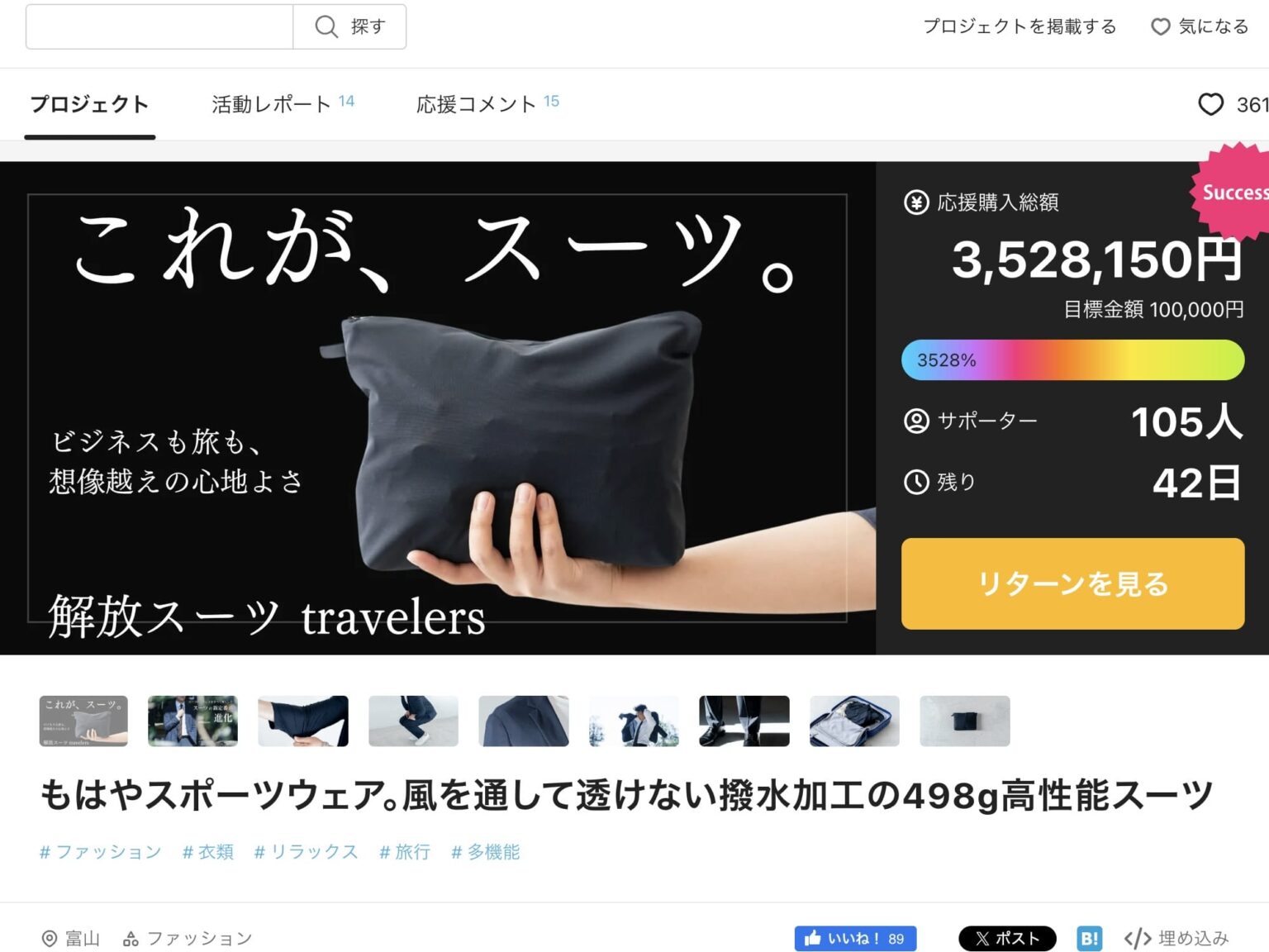 前作で起用したモデルを起用することを始め、撮影ではチーム全体で前回の世界観を踏襲しつつ、よりビジネス寄りの演出を意識。前回同様のホテルのロケーションに加え、金沢市内のブックカフェの一角も活用し、落ち着きと知性、実用性が共存するビジュアルに仕上げました。撥水性やパッカブルといった特長は、GIFや動画を活用して直感的に伝達。さらに、プロジェクト開始前から提携会社にティザー広告の、SNSと連動させた情報設計によって認知拡大を図りました。また、前作商品との比較演出を加えることで、どこがどう進化したのかを明確に印象づけ、ブラッシュアップされた魅力を視覚的に伝える構成としました。前回の実績は早々に超え、プロジェクト終了日まで41日を残す本日、目標金額を3528%達成。まだまだ勢いは止まりません。