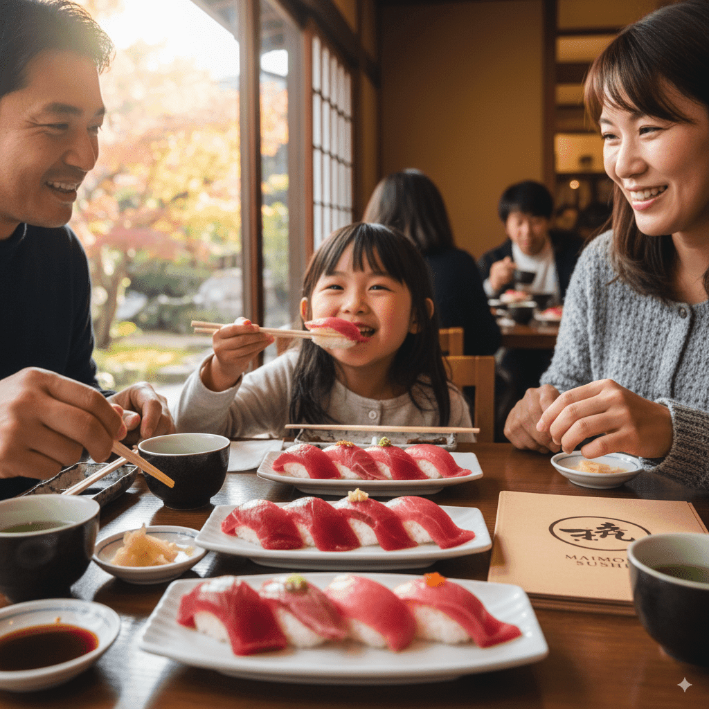 まいもん寿司のマグロは、子どもでも食べやすいのがうれしいポイントです。お寿司は大きすぎず、一口で食べられるので安心です。家族で一緒に味わえば、きっと楽しい思い出になりますよ。おすすめの時間は秋のお昼ご飯です。秋は海の幸が特においしい季節で、混雑も少し落ち着いているのでゆっくり楽しめます。お昼なら明るい雰囲気の中で食べられ、家族みんなで海鮮を堪能できます。