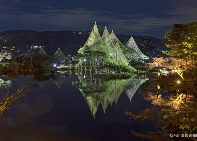 静かな夜に浮かぶ、北陸の冬の風物詩「雪吊り」。冬の景色とともに華やかなライトアップを楽しめます。