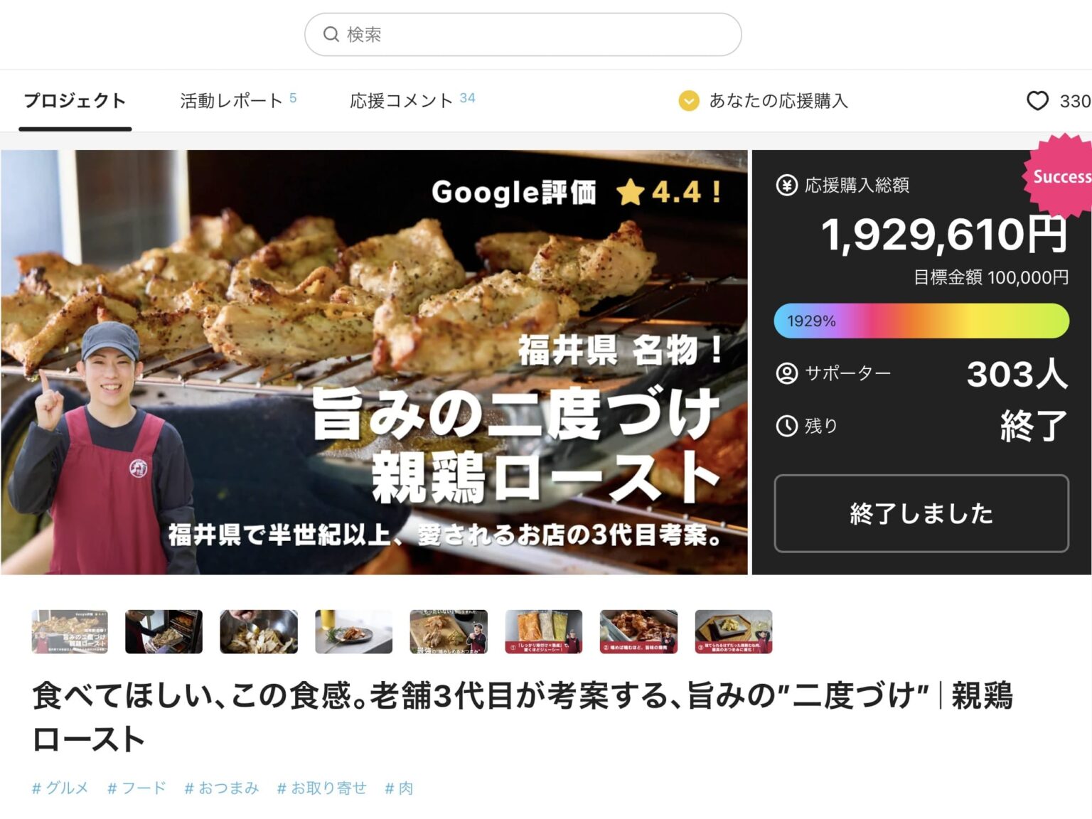 シズル感のあるおいしそうなビジュアル × 勢いのあるデザイン × 背景を伝える物語性――この三位一体を軸に、構成・コピー・編集を一貫して設計しました。まず“親鶏ロースト”を冒頭で端的に可視化し、焼きたての湯気と艶やかな照りを捉えた寄りカットで食欲を直撃、その流れで商品紹介へ展開しました。さらに「二度づけ製法」(旨みが重なる工程=下味→追いだれ)を文章とミニ図解で可視化。あわせて、老舗精肉店として積み上げてきた「手切り・当日売り切り」「BBQなら前田かしわ店」の信頼、三代にわたり愛されてきた歩み、三代目のメッセージやアンケート結果を束ね、背景が伝わる物語に仕上げています。Instagramフォロワー1万人超の三代目・前田大志さんの明るく前向きな人柄が自然に伝わる登場導線を設け、親近感と熱量を応援購入意欲へとつなげました。「移転前の挑戦」であることも踏まえ、“福井で一番の精肉店として全国へ”という意思を核に全国を見据えた表現に整え、結果としてプロジェクトは目標を達成し、金額面だけでなく多くの応援購入へと結びつきました。