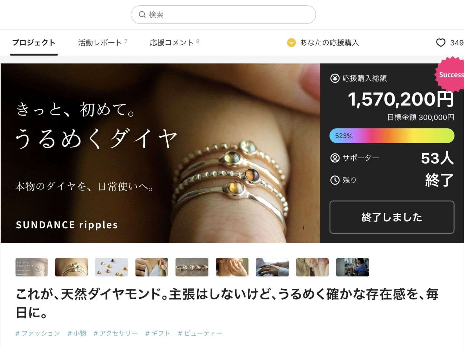 金沢・竪町のアトリエ併設ジュエリーショップSUNDANCE(サンダンス)様。クラフトマンシップに定評があり、ブライダルジュエリーでも支持を集める金沢を代表するお店です。「日常の中の本物」を届けるため販路拡大を目指し、Makuakeに挑戦されました。独自の切り口として、きらめきの強いファセットカットとは異なる、穏やかな艶をもつカボションカットのダイヤモンドを提案。カボションだからこそ表現できる“静かな存在感”を伝えるべく、雫のように小さく丸い静かな輝きから着想し「うるめくダイヤ」と命名しました。代表の好奇心と挑戦心、そして独自の価値を丁寧に届けるプロジェクトとして、今後のシリーズ展開も視野に入れています。