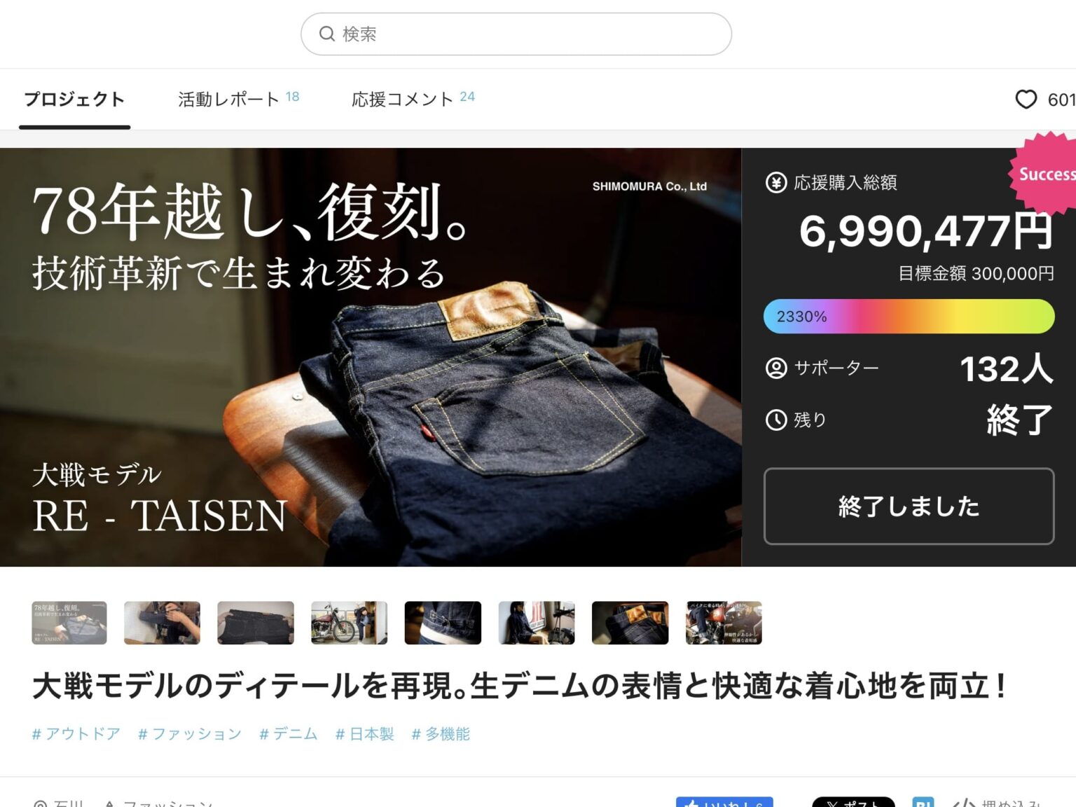 石川県小松市の繊維商社・株式会社シモムラ様は、第二次大戦期の名作“大戦モデル”を現代に蘇らせるプロジェクト「RE-TAISEN」でMakuakeに挑戦しました。目指したのは、単なる復刻ではなく“日常で楽しめる本格”です。快適な着用感はシモムラ独自開発の特殊ストレッチ技術「GUINNEST®」によるもので、生地は福山・カイハラ製の本格生デニムを採用し、ザラ感や深い色、経年変化といった生デニムならではの魅力に、優れた伸長回復性を掛け合わせて形状保持と可動性を両立しました。縫製は愛知・豊田の工房「Little Hand」がヴィンテージミシンを整備・使用し、当時の仕様を忠実に再現。クラシックな意匠と現代的な快適性が出会う一本を目指されています。