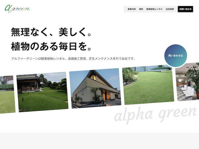 石川県野々市市を拠点とする総合造園土木会社『株式会社アルファーグリーン』様。創業から30年以上にわたり、造園施工管理や芝生メンテナンスを中心に、緑豊かな空間づくりを手がけてこられた“緑と芝生のプロフェッショナル”です。 もともとは、2025年春にスタートする新サービス「観葉植物レンタル」の告知を目的とした、短納期でのチラシ制作をご依頼いただきました。そのヒアリングを進める中で、「会社サイトが存在せず、これまでの施工実績をオンライン上で紹介できていない」という課題も明らかに。多数の施工写真データを保有されていながら、タブレット内に留まっており、対面以外のお客様には事例を見せる手段がないという悩みを抱えていらっしゃいました。