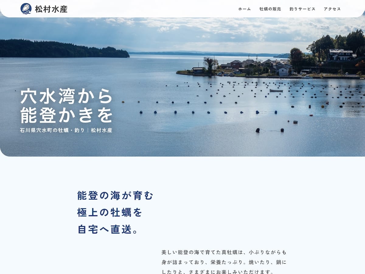 まずは現地での取材を通して、松村水産の代表・松村様が大切にしている考え方や、どのような思いで海と向き合っているのかを丁寧にヒアリングし、単に商品やサービスを並べるのではなく、「どんな人が、どんな環境で、どんな思いで提供しているのか」が伝わることを重視して構成しました。撮影においても、能登の海の美しさや養殖現場の空気感が伝わるよう、天候や光の入り方にも配慮。実際に現場を見て感じた魅力を、写真と文章の両面からホームページに落とし込みました。完成したサイトは、販売している海産物や、釣り船・釣り筏といったサービスだけでなく、松村水産様の人柄や仕事への姿勢も伝わる内容となり、「写真がきれいで分かりやすい」と好評をいただいています。注文方法であるFAXや電話、SNSへの導線のハブとしても機能し、安心して問い合わせができる公式サイトが完成しました。