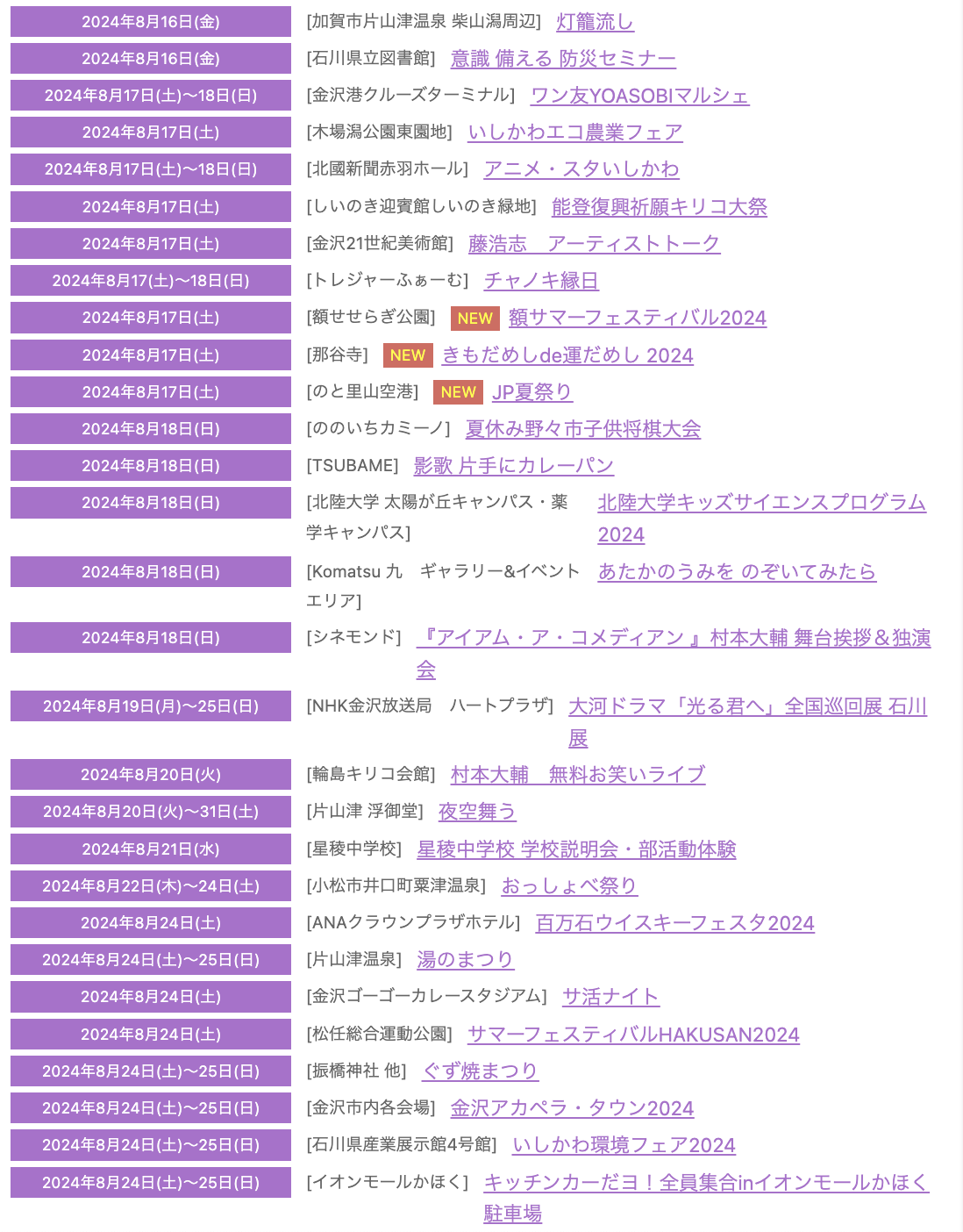 夏真っ盛りの今の時期。ファミリーや友人、カップルで足を運びたい8月〜期間中の石川県のイベントをまとめました。アートを感じられるイベントや趣あるわくわくイベントも追加しています。NEW! は今週新たに追加されたイベントなので、要チェックですよ!