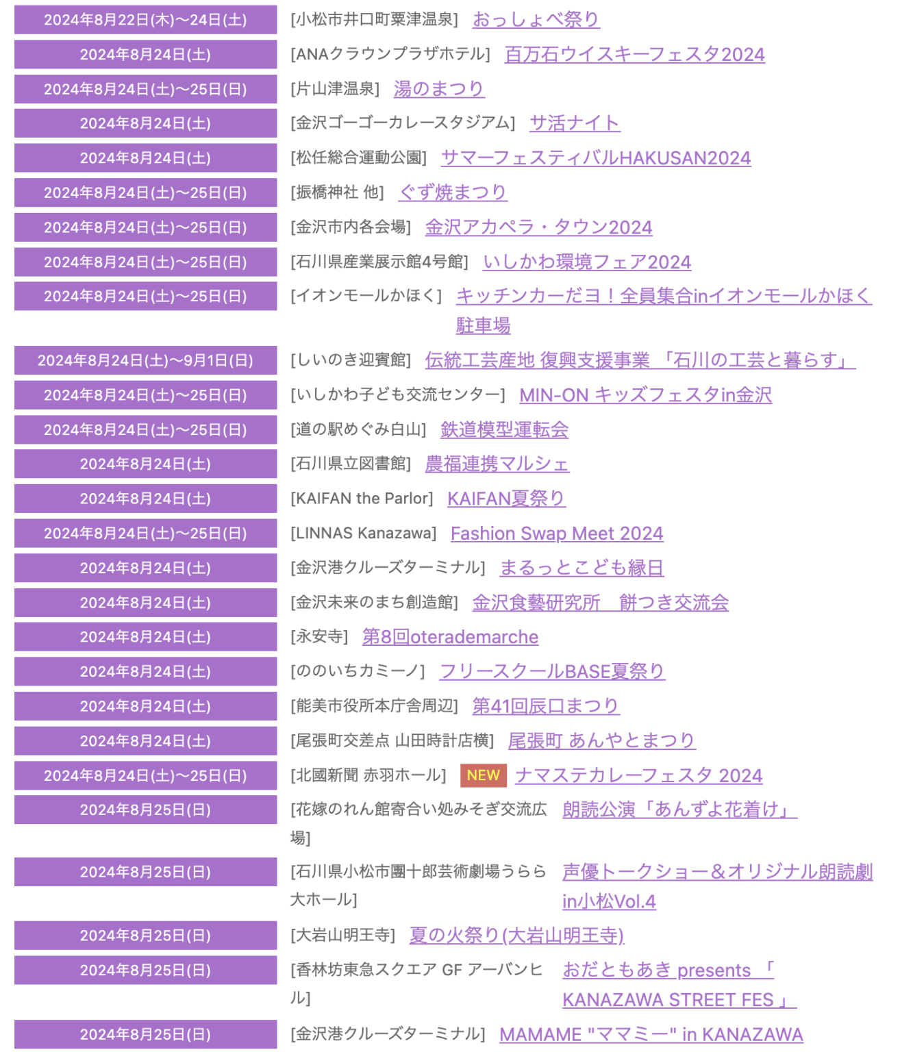 8月も後半ですが、注目のイベントがどんどん追加されています。ファミリーで行きたいイベントや友人とワイワイ言いながら足を運びたい8月〜期間中の石川県のイベントをまとめました。NEW! は今週新たに追加されたイベントなので、要チェックですよ!