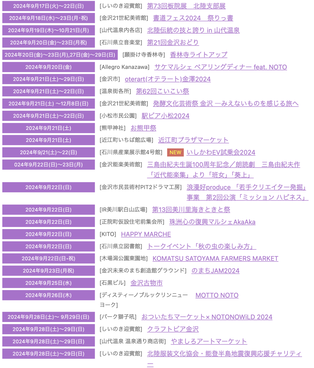 厳しい残暑が続きますが、今週末も3連休! お出かけの計画はたてましたか? 9月〜期間中の石川県のイベントをまとめました。NEW! は今週新たに追加されたイベントなので、要チェック!