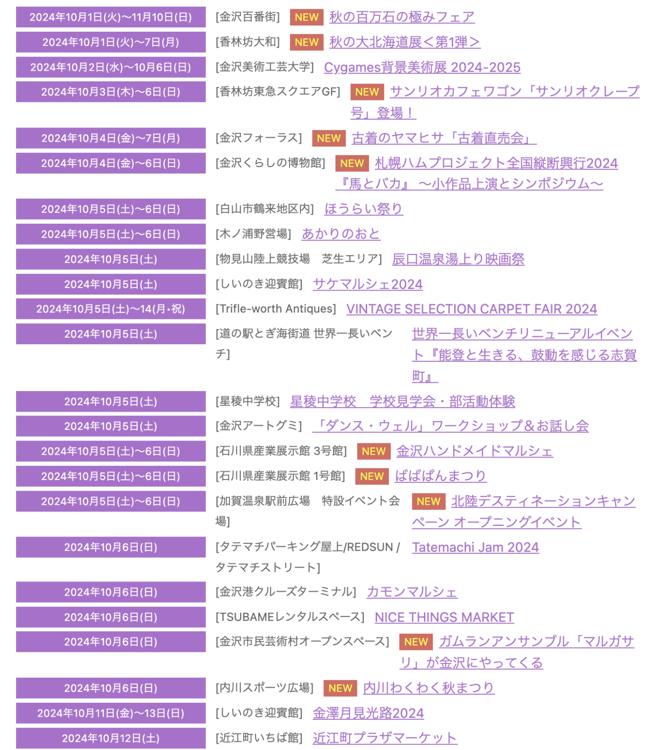 涼しさを感じる時間が増えて、過ごしやすい季節になってきましたね。行楽・芸術・食欲の秋♪ お出かけの計画はたてましたか? 10月〜期間中の石川県のイベントをまとめました。NEW! は今週新たに追加されたイベントなので、要チェック!