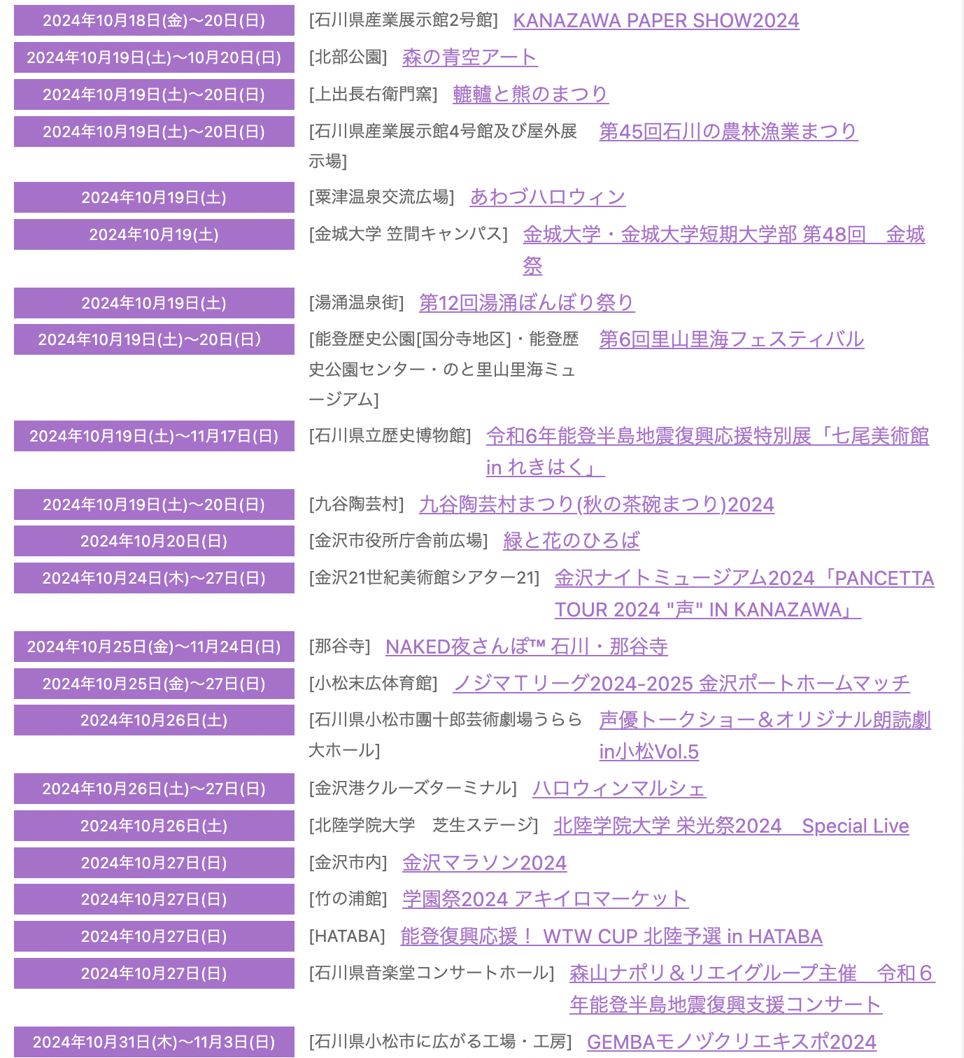 金沢や石川での観光とおでかけを楽しむなら、金沢日和のこのガイド!人気のイベントやスポット、グルメ、季節ごとの楽しみ方をまとめました。北陸の文化と自然を堪能するためのおすすめ情報はチェックしてくださいね。2024年10月に開催される石川県内のイベントです。