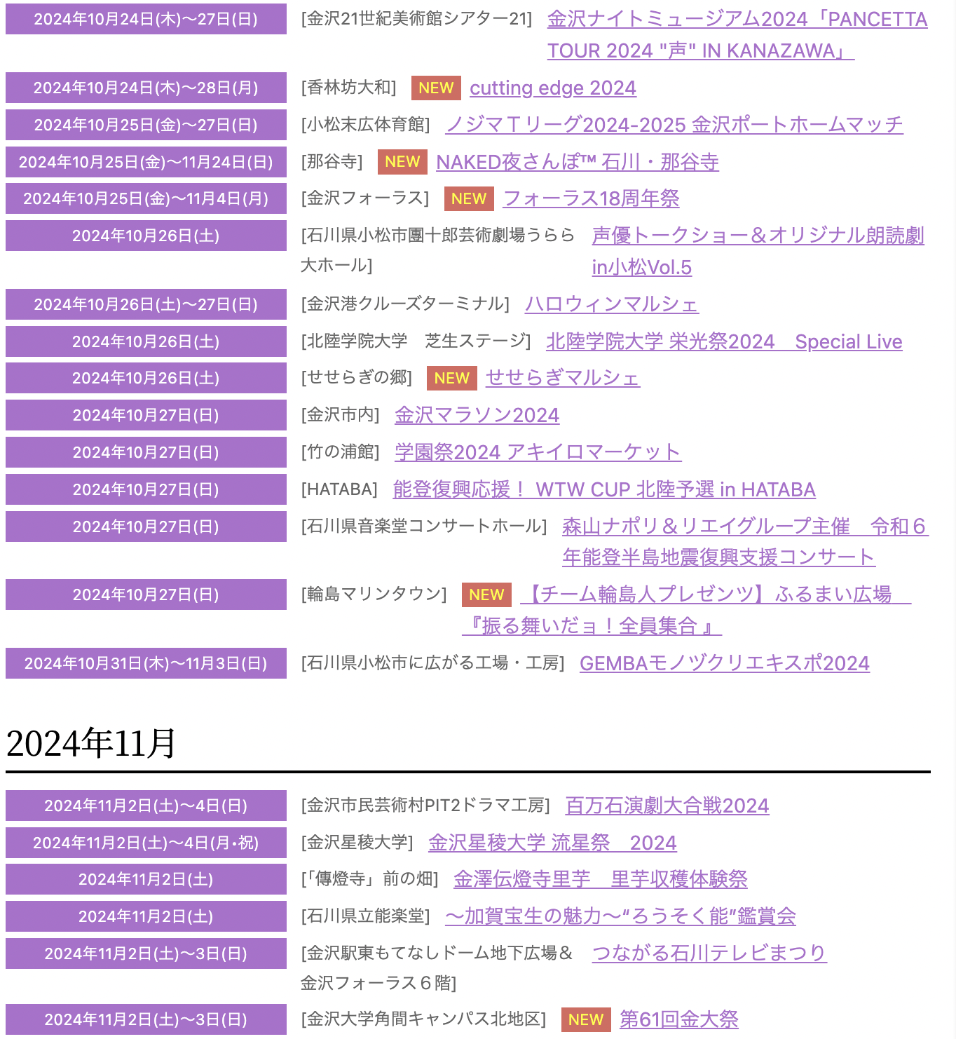 体を動かすのが心地よい時期。お散歩がてらイベントに足を運ぶのもおすすめです。10月〜期間中の石川県のイベントをまとめました。NEW! は今週新たに追加されたイベントなので、要チェック!