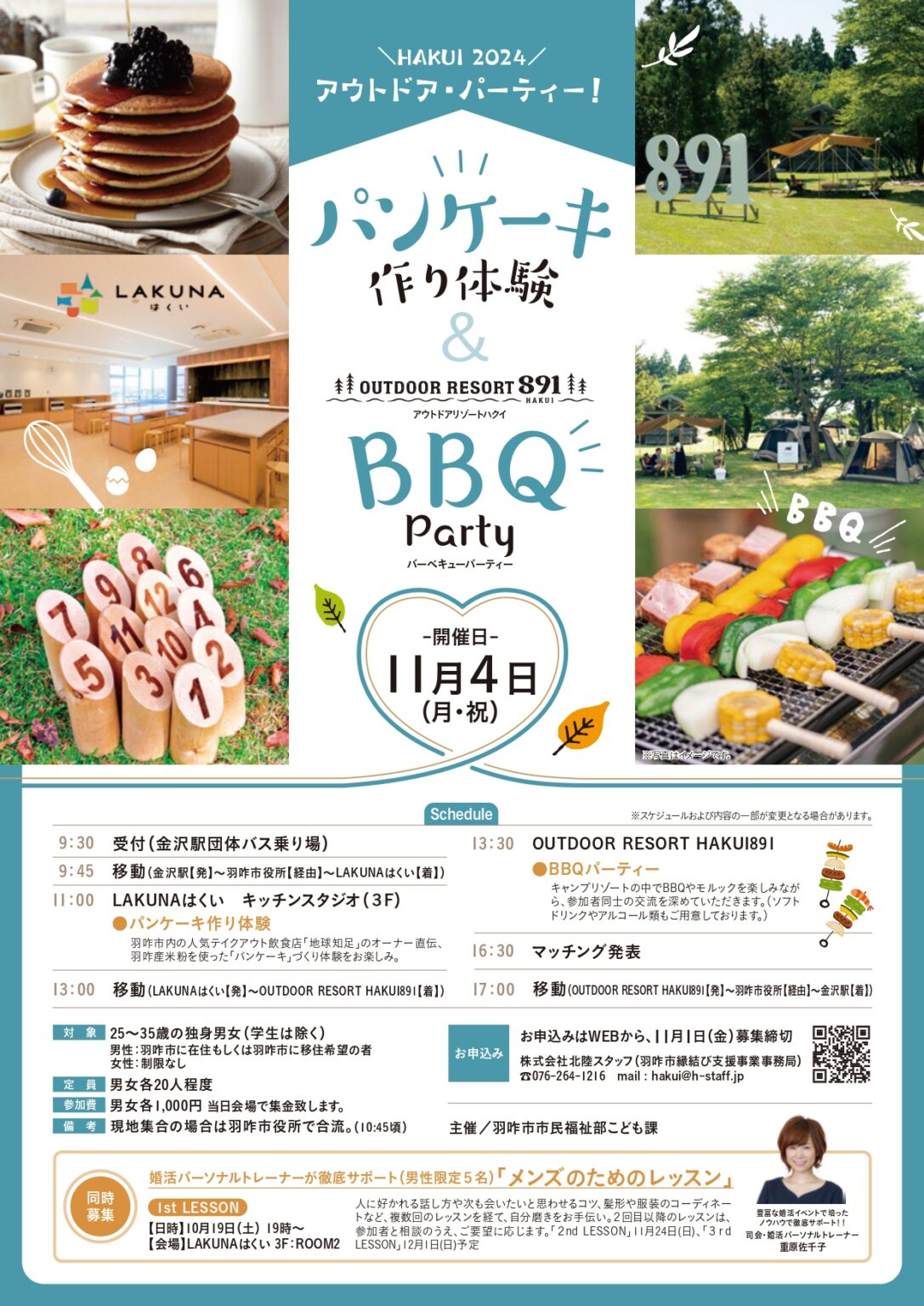 パンケーキ作り&BBQ or『気多大社』での禊体験&ビュッフェ。【11月4日(月・休)・12/14(土)】