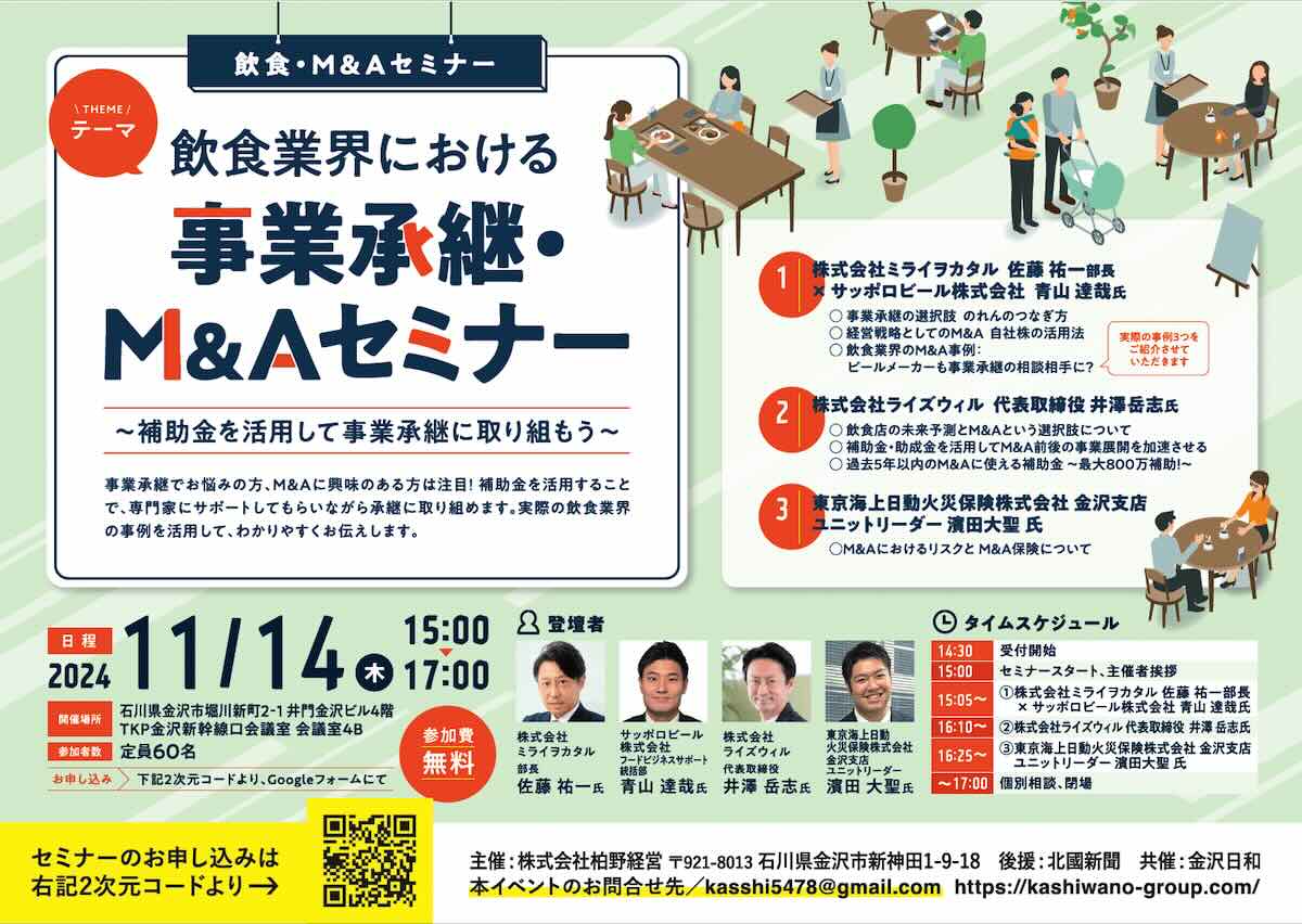 【参加者募集】飲食業界における事業承継・M&Aセミナー 〜補助金を活用して事業承継に取り組もう〜【11/14(木)】