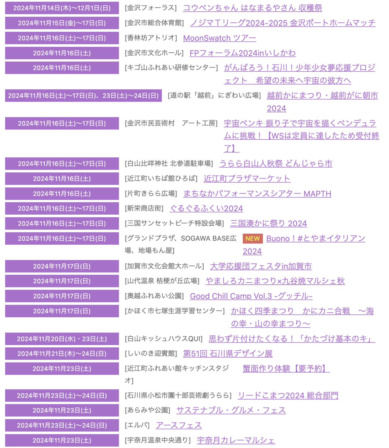 二十四節気の一つ「小雪」はわずかな雪が降る頃という意味があり、今年は11月22日です。だんだんと寒さが近づいてきますね。11月〜期間中の石川県のイベントをまとめました。NEW! は今週新たに追加されたイベントなので、要チェック!