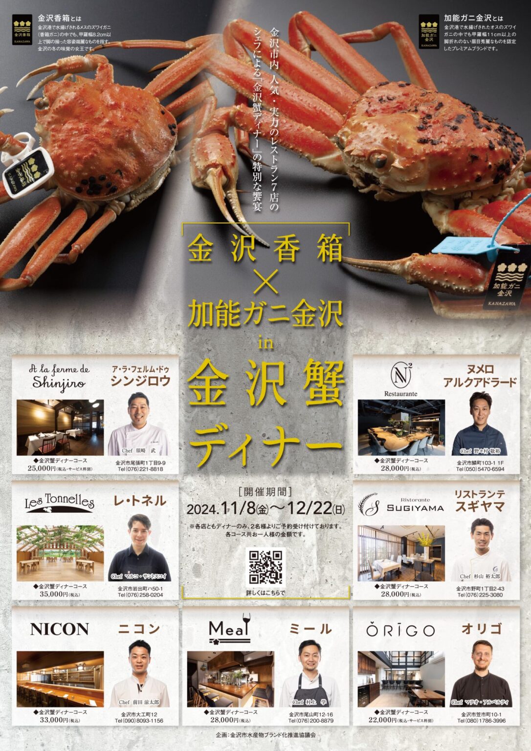 金沢の冬の味覚の王様ともいえる蟹。その豊かな味わいを心ゆくまで堪能できる「金沢香箱×加能ガニ金沢in金沢蟹ディナー」がスタートする。金沢市内の人気レストラン7店のシェフによる特別な饗宴を楽しめる。