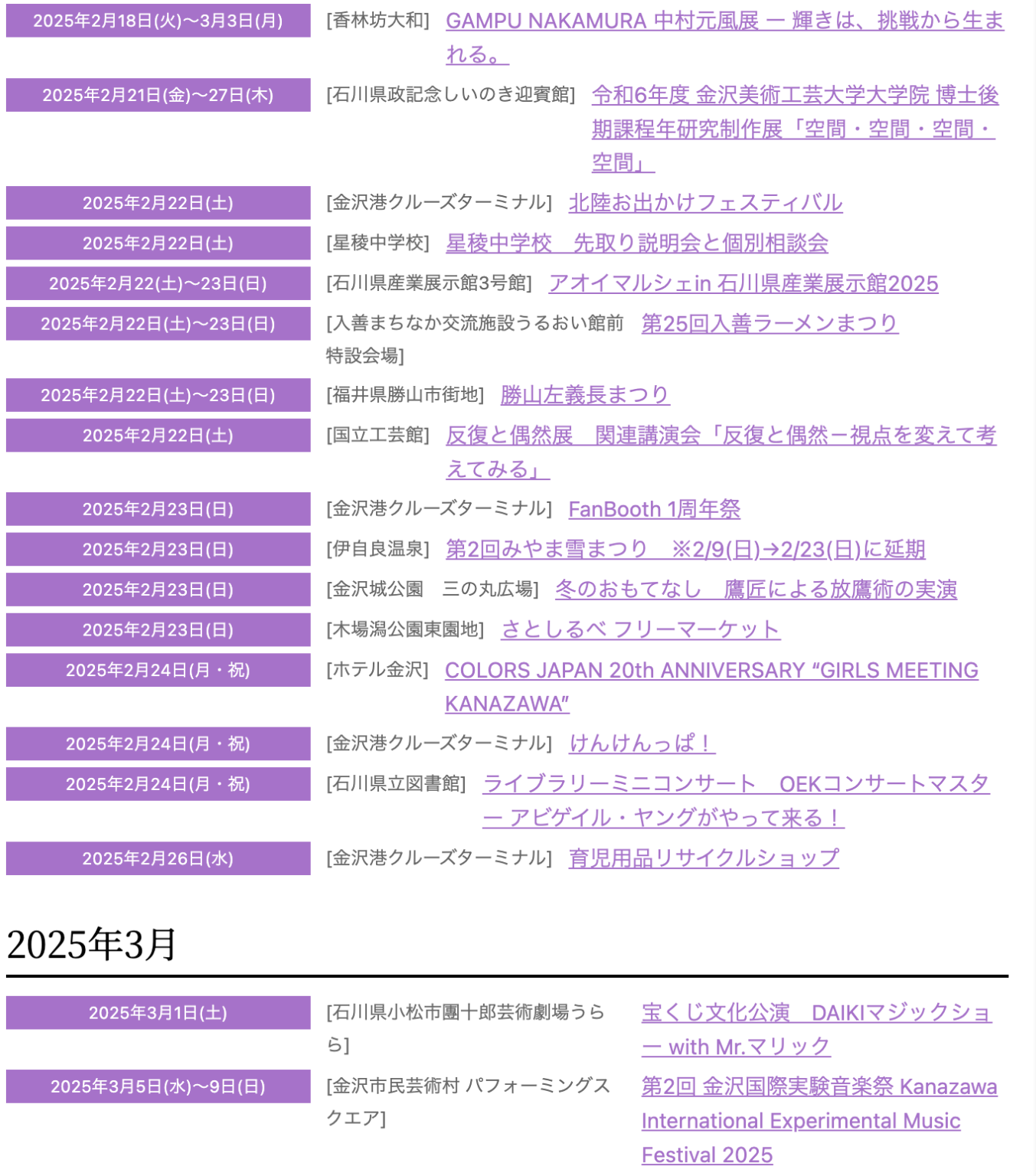 金沢や石川での観光とおでかけを楽しむなら、金沢日和のこのガイド!人気のイベントやスポット、グルメ、季節ごとの楽しみ方をまとめました。北陸の文化と自然を堪能するためのおすすめ情報はチェックしてくださいね。2025年2月に開催される石川県内のイベントです。