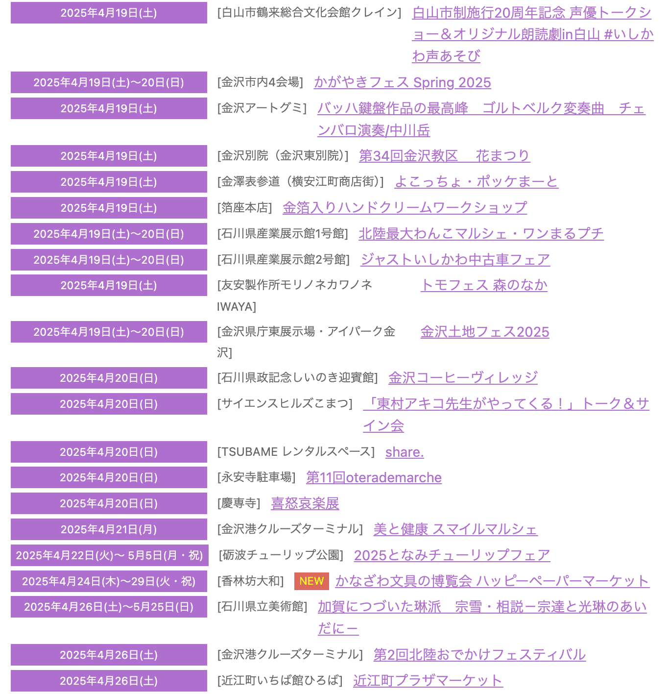 金沢や石川での観光とおでかけを楽しむなら、金沢日和のこのガイド!人気のイベントやスポット、グルメ、季節ごとの楽しみ方をまとめました。北陸の文化と自然を堪能するためのおすすめ情報はチェックしてくださいね。2025年4月に開催される石川県内のイベントです。