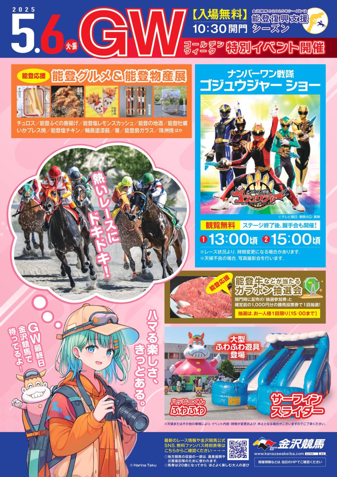 ゴールデンウィークのお出かけ先に迷ったら、楽しいイベントが満載の『金沢競馬場』がおすすめ。迫力満点のレースに加え、「ナンバーワン戦隊ゴジュウジャーショー」や「大型エア遊具・サーフィンスライダー」、「ハッピーくんふわふわ遊具」など、子どもたちに人気のアトラクションが勢ぞろい。能登物産展も同時開催。