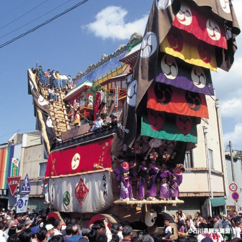 七尾4大祭の一つ。歌舞伎の名場面を設えた3基の巨大な「でか山」が見もの。【5/3(土)〜5(月)】