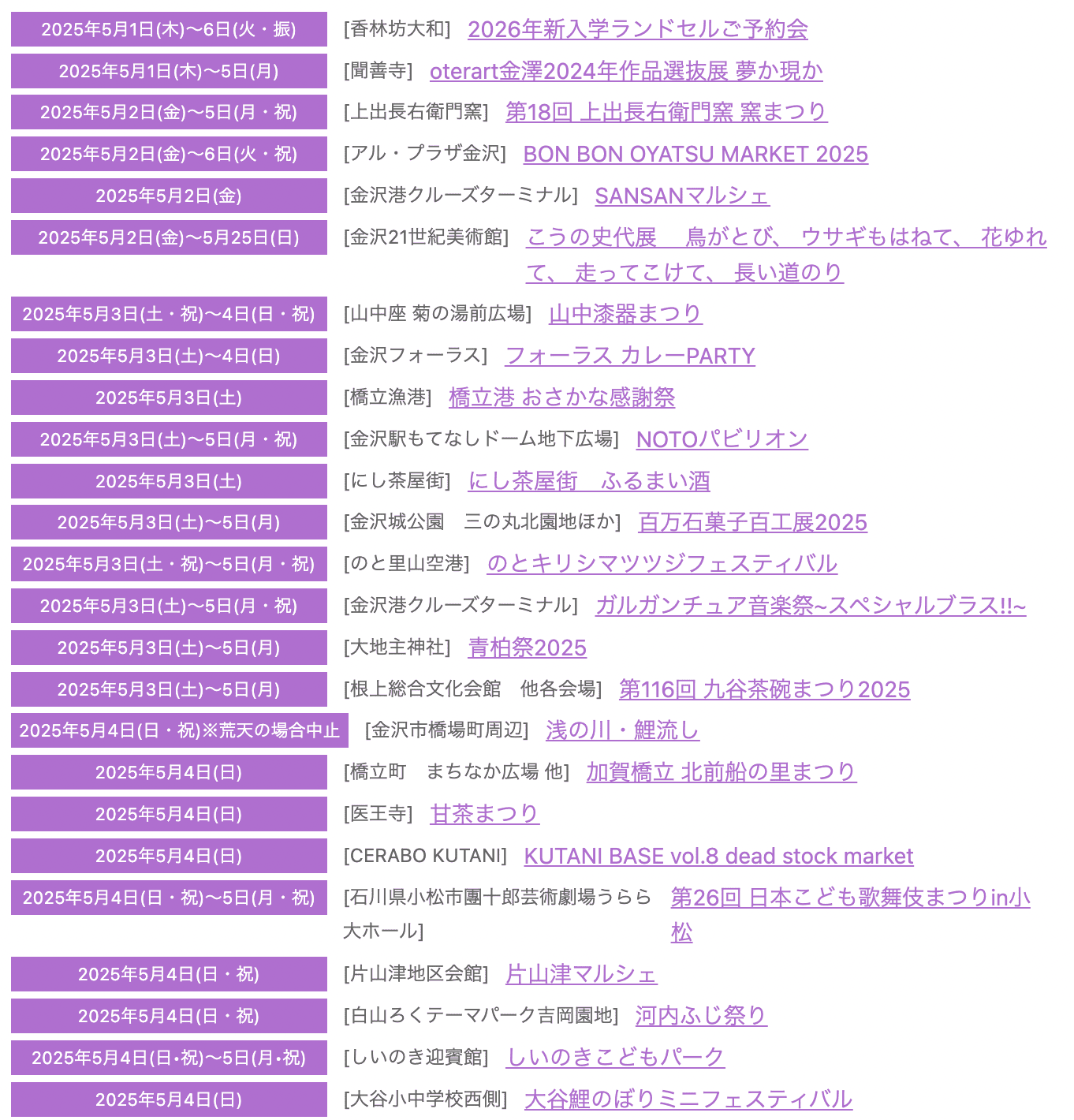 金沢や石川での観光とおでかけを楽しむなら、金沢日和のこのガイド!人気のイベントやスポット、グルメ、季節ごとの楽しみ方をまとめました。北陸の文化と自然を堪能するためのおすすめ情報はチェックしてくださいね。2025年5月に開催される石川県内のイベントです。