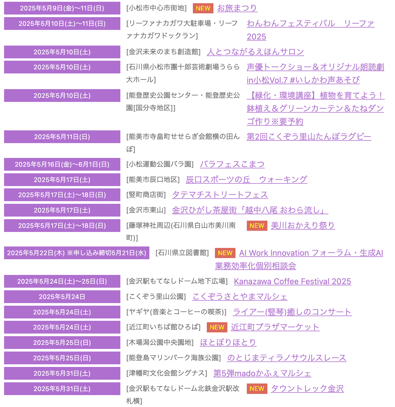 金沢や石川での観光とおでかけを楽しむなら、金沢日和のこのガイド!人気のイベントやスポット、グルメ、季節ごとの楽しみ方をまとめました。北陸の文化と自然を堪能するためのおすすめ情報はチェックしてくださいね。2025年5月に開催される石川県内のイベントです。