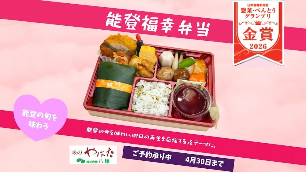 新しい始まりや大切な方との集まりが増えるこの時期、「八幡のすしべん」のお弁当はいかがでしょうか。おすすめは、日本全国の優れた惣菜や弁当を評価するプロ向けの商品コンテスト「惣菜・べんとうグランプリ2026」で金賞を受賞した「能登福幸(のとふっこう)弁当〈春〉」。石川県産「ひゃくまん穀」を使用した中島菜ごはんを主役に、能登産のブリや豚肉、地元の伝統野菜などが彩り豊かに並びます。