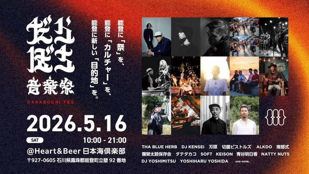 伝統ある祭りや自然豊かな暮らしが息づく能登の地に新たなカルチャーが生まれようとしています。2026年5月16日(土)に能登町「Heart & Beer 日本海倶楽部」で開催される「だらぼち音楽祭」。震災から歩みを進めるこの地に、単なる復興を超えた、心躍る“目的地”を作りたい。そんな地元の人々の純粋な願いから生まれた音楽祭です。