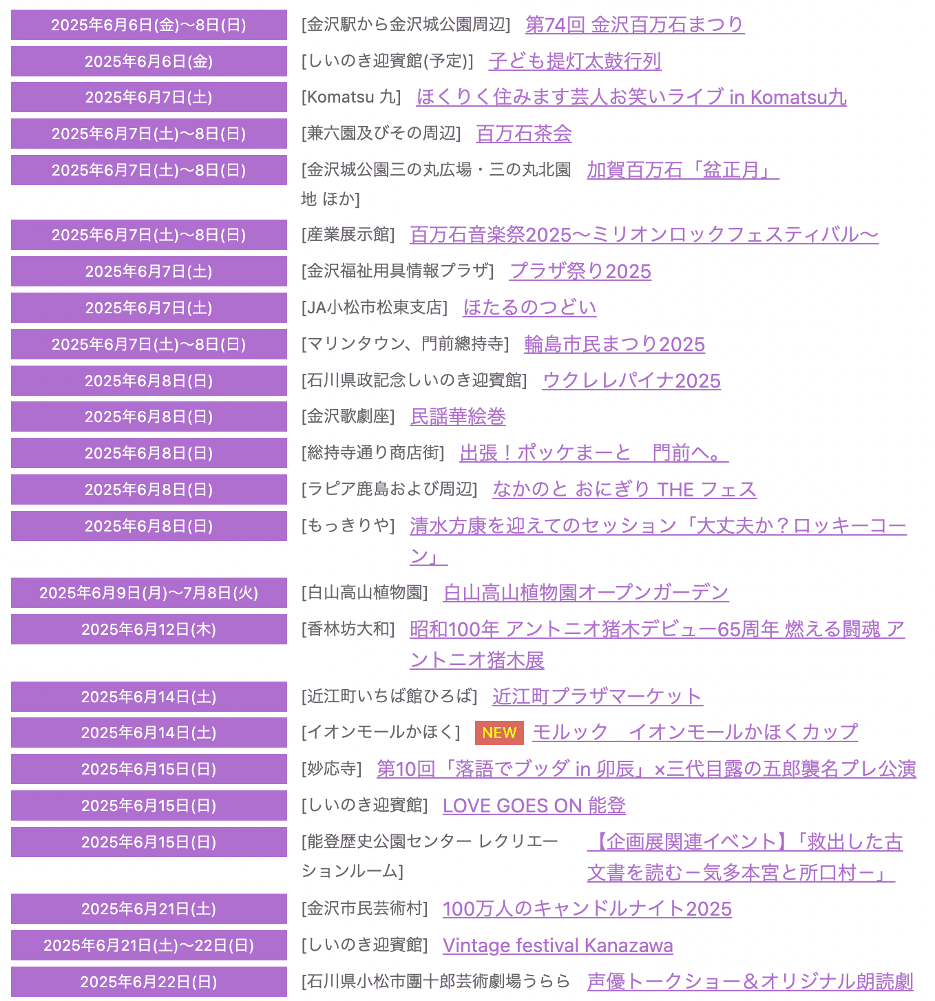 金沢や能登、加賀エリアで2025年6月に開催される石川県内の人気のイベントやお祭りの情報をまとめました。北陸の文化と自然を堪能するためのおすすめ情報満載ですので、お出かけ前にチェックしてくださいね。