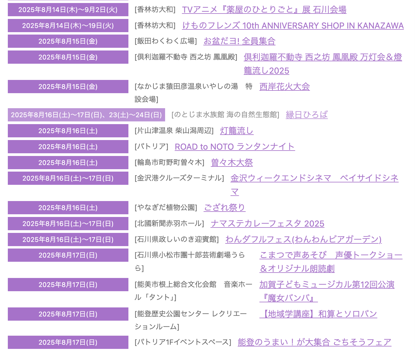 金沢や能登、加賀エリアで2025年8月に開催される石川県内の人気のイベントやお祭りの情報をまとめました。北陸の文化と自然を堪能するためのおすすめ情報満載ですので、お出かけ前にチェックしてくださいね。