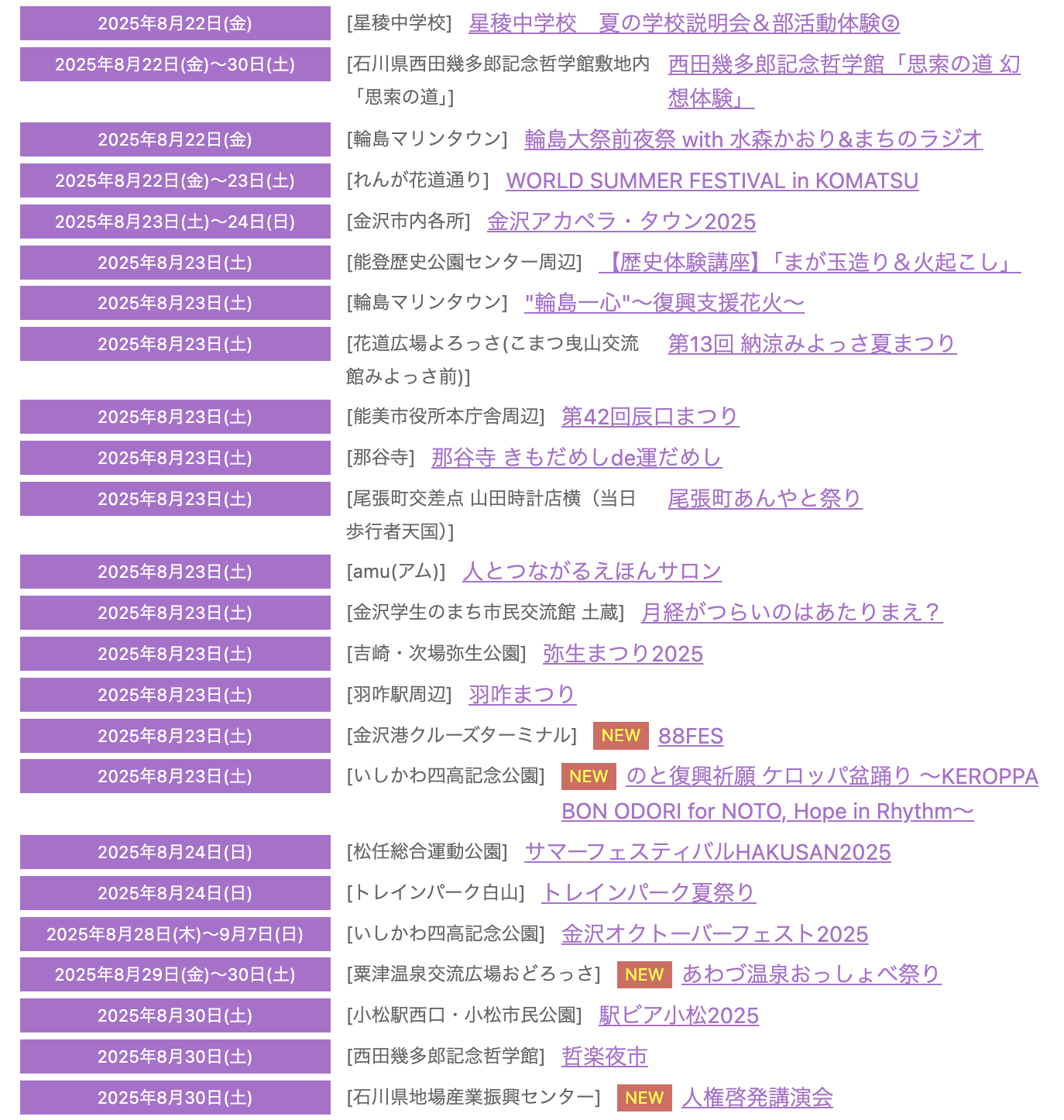 金沢や能登、加賀エリアで2025年8月に開催される石川県内の人気のイベントやお祭りの情報をまとめました。北陸の文化と自然を堪能するためのおすすめ情報満載ですので、お出かけ前にチェックしてくださいね。
