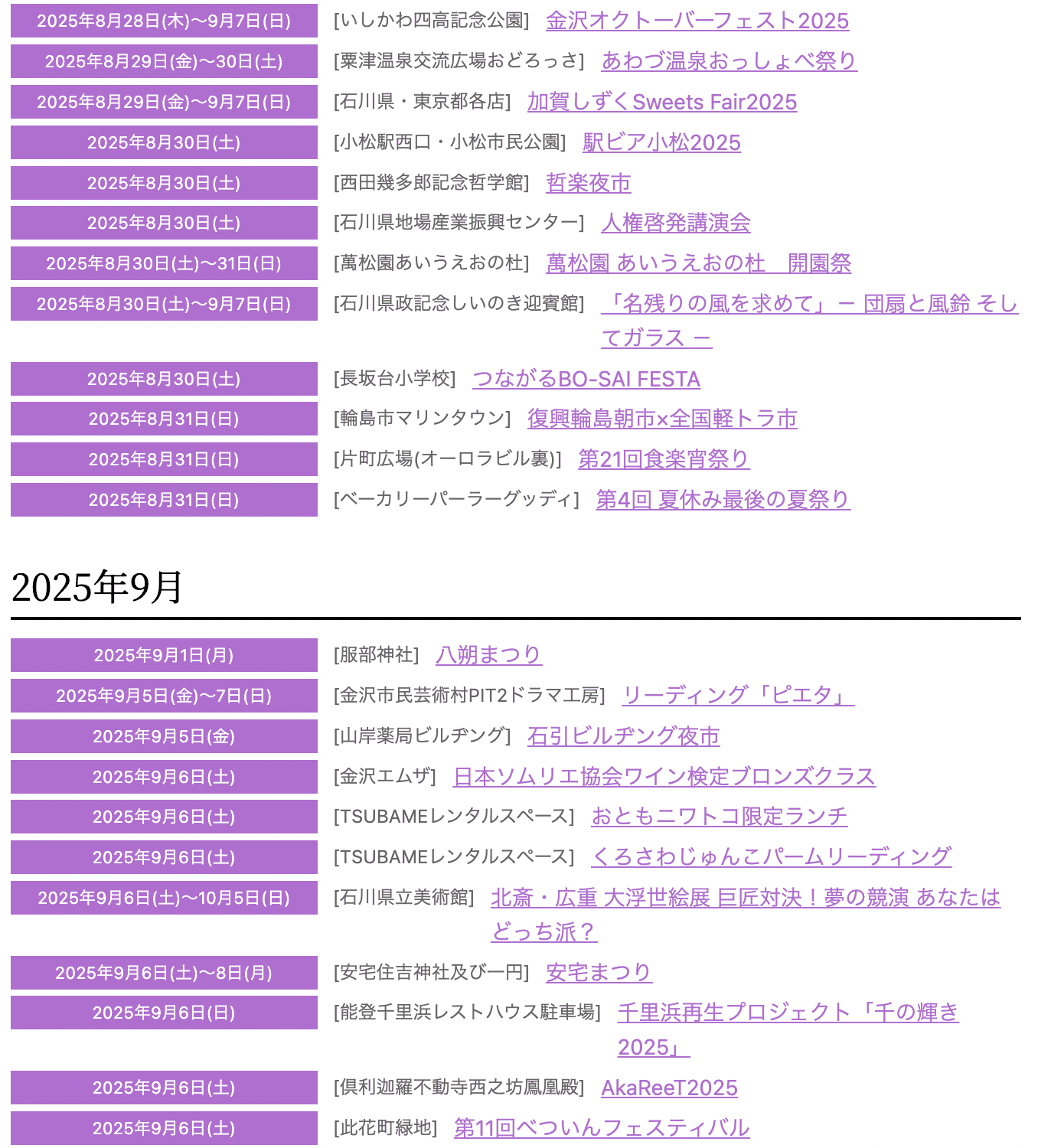 金沢や能登、加賀エリアで2025年8・9月に開催される石川県内の人気のイベントやお祭りの情報をまとめました。北陸の文化と自然を堪能するためのおすすめ情報満載ですので、お出かけ前にチェックしてくださいね。