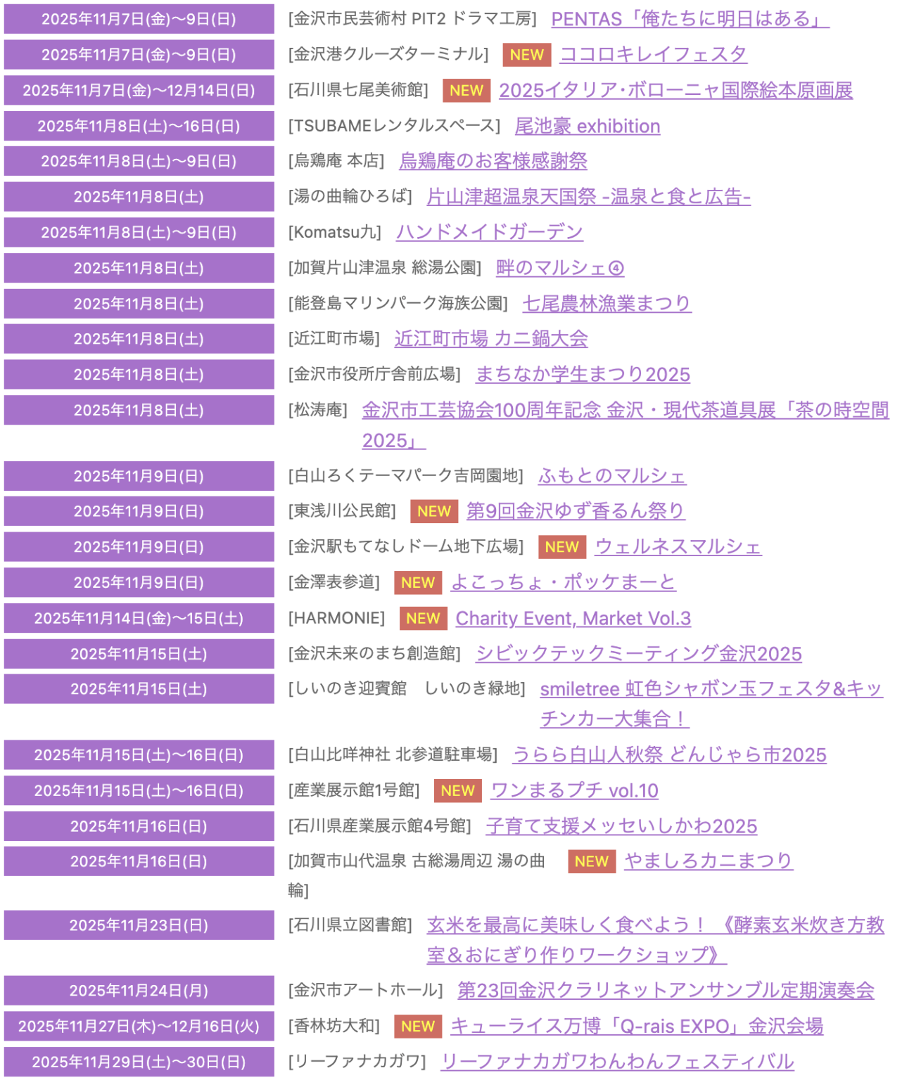 金沢や能登、加賀エリアで2025年11月に開催される石川県内の人気のイベントやお祭りの情報をまとめました。北陸の文化と自然を堪能するためのおすすめ情報満載ですので、お出かけ前にチェックしてくださいね。