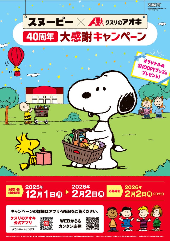 クスリのアオキ40周年を記念して、スヌーピーとコラボした大感謝キャンペーンを開催中。会計時にAocaカードを提示し、1会計あたり税込5,000円以上(5,000円コース)または税込3,000円以上(3,000円コース)を1口として、オリジナルのスヌーピーグッズの抽選に応募できる。