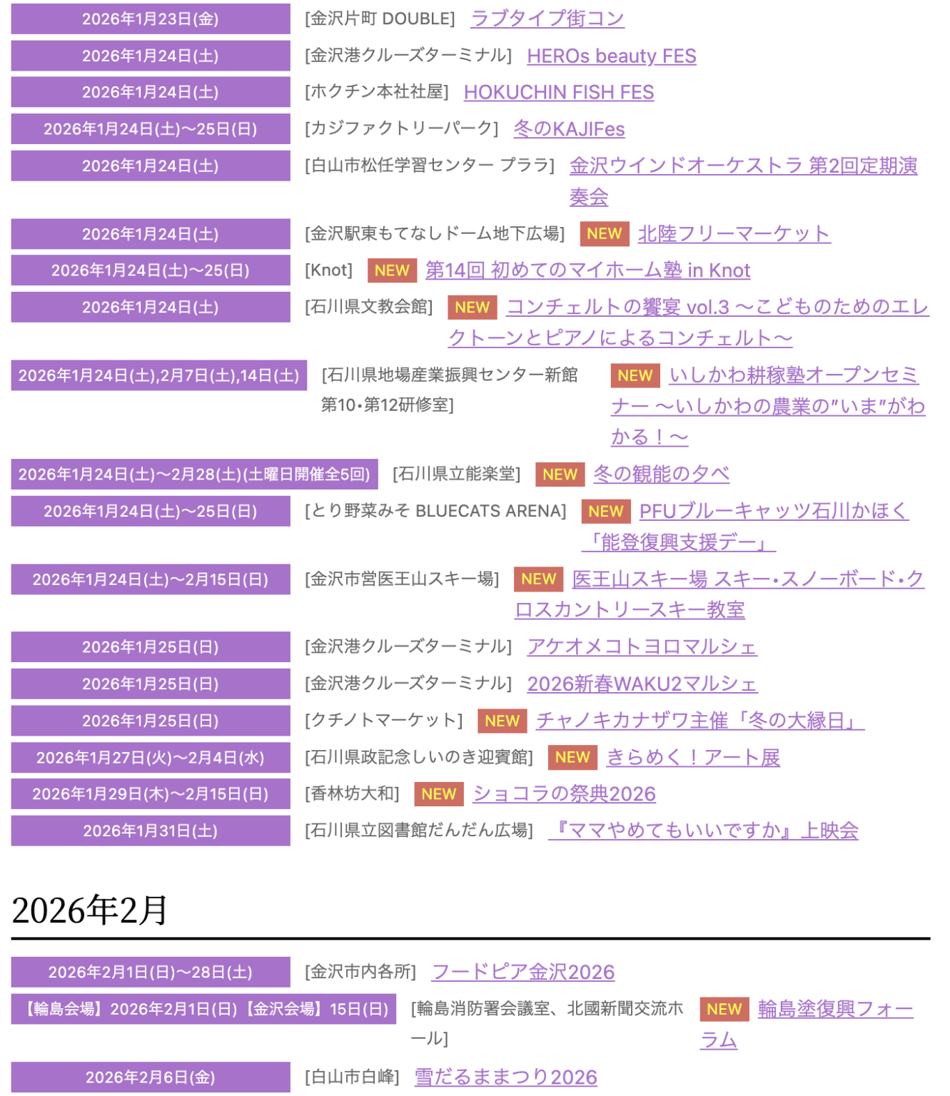 金沢や能登、加賀エリアで2026年1月に開催される石川県内の人気のイベントやお祭りの情報をまとめました。北陸の文化と自然を堪能するためのおすすめ情報満載ですので、お出かけ前にチェックしてくださいね。