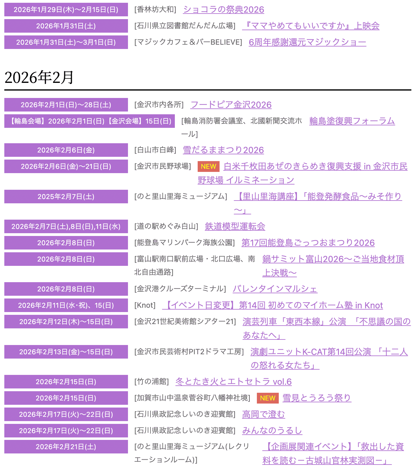 金沢や能登、加賀エリアで2026年1月に開催される石川県内の人気のイベントやお祭りの情報をまとめました。北陸の文化と自然を堪能するためのおすすめ情報満載ですので、お出かけ前にチェックしてくださいね。