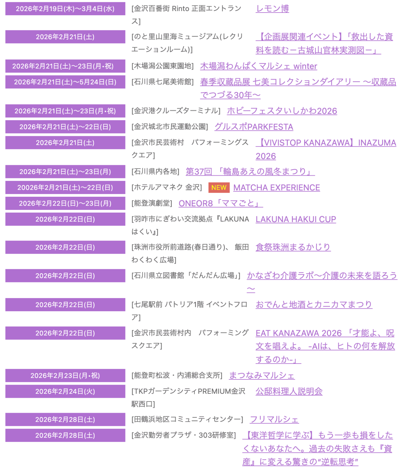 金沢や能登、加賀エリアで2026年2月に開催される石川県内の人気のイベントやお祭りの情報をまとめました。北陸の文化と自然を堪能するためのおすすめ情報満載ですので、お出かけ前にチェックしてくださいね。
