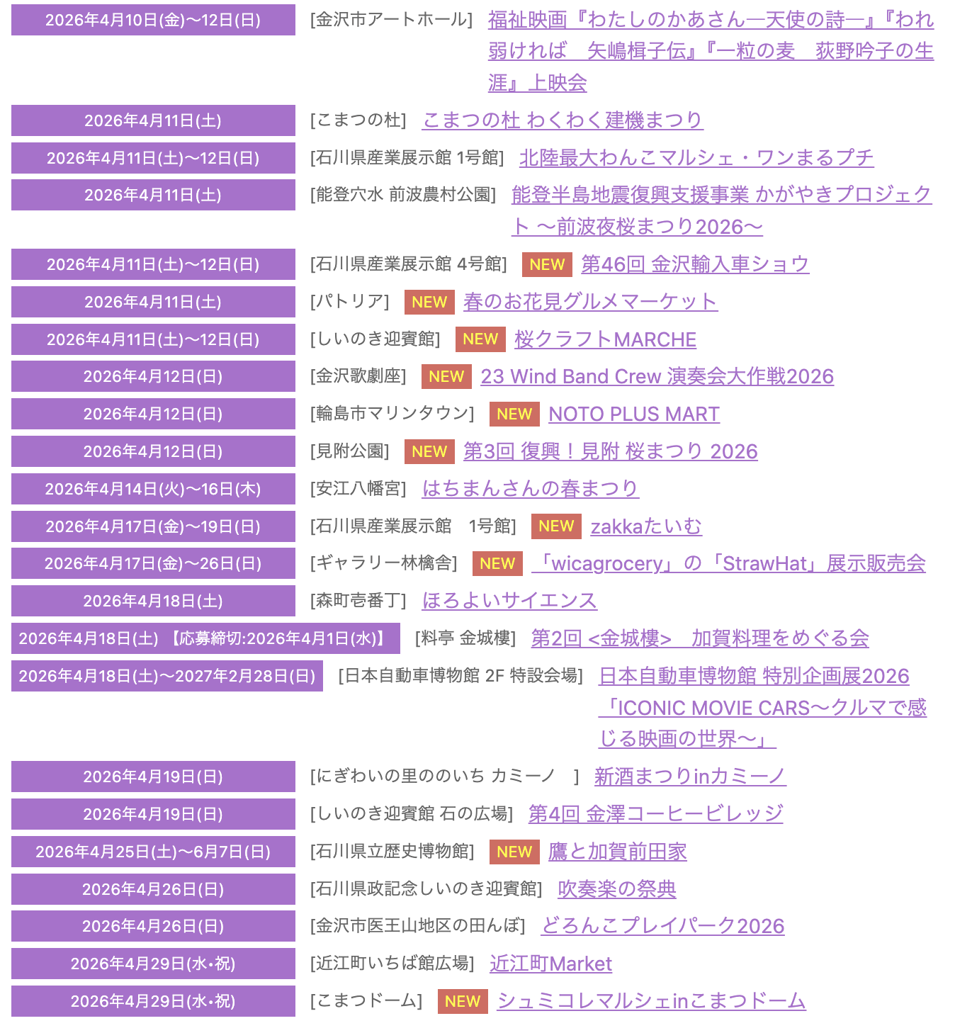 金沢や能登、加賀エリアで2026年4月に開催される石川県内の人気のイベントやお祭りの情報をまとめました。北陸の文化と自然を堪能するためのおすすめ情報満載ですので、お出かけ前にチェックしてくださいね。
