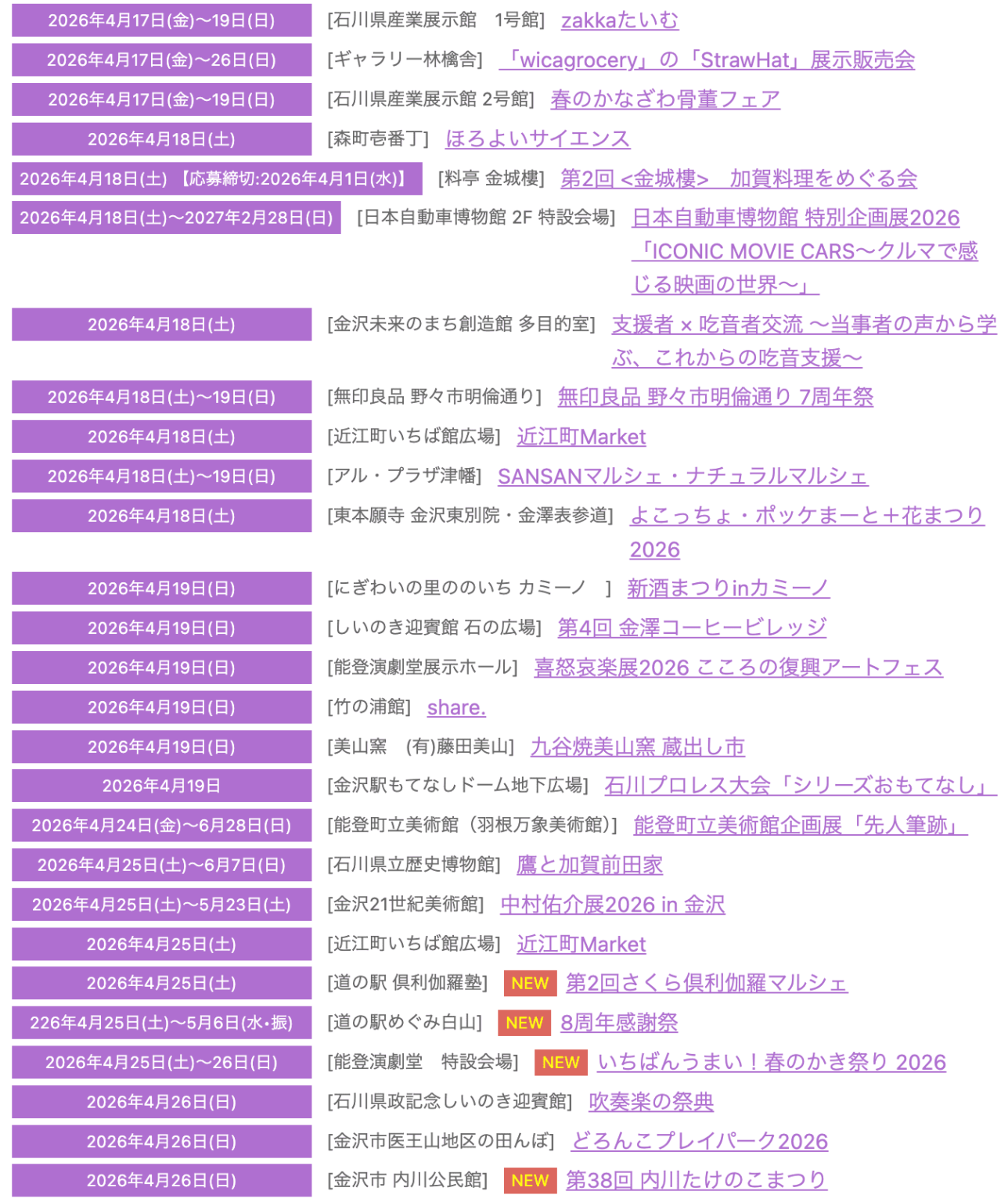 金沢や能登、加賀エリアで2026年4月に開催される石川県内の人気のイベントやお祭りの情報をまとめました。北陸の文化と自然を堪能するためのおすすめ情報満載ですので、お出かけ前にチェックしてくださいね。
