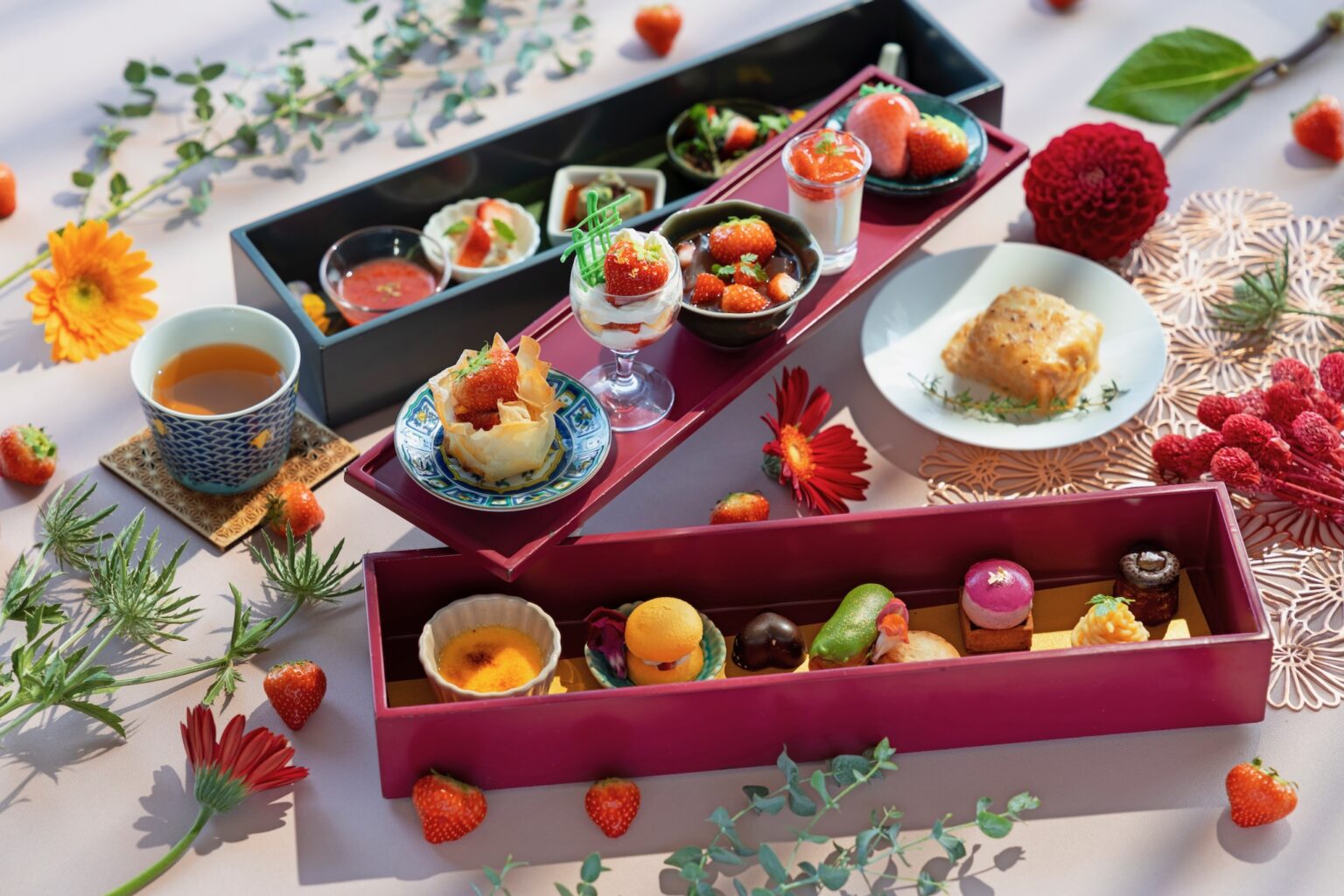和テイストのアフタヌーンティーセット<雅(みやび)>に、ブランド苺「あまおう」を彩り豊かに使った期間限定の新バージョンが登場している。フランス語で「石川のこころ」の意を持つ、『ANAクラウンプラザホテル金沢』のオリジナルスイーツブランド「LE CŒUR D’ISHIKAWA(クール ド ISHIKAWA)」を冠したアフタヌーンティーセットだ。和歌の短冊箱をイメージした器には、苺アーモンドパイや苺のグラスショートケーキなどの苺スイーツのほか、石川県産の能登大納言小豆や五郎島金時、生麩といった地元素材を使ったスイーツとセイボリーを、宝石箱のように美しく詰め合わせている。フリーフローのドリンクは、石川産のハーブを使ったホテルオリジナルハーブティーや、香り高い紅茶、加賀棒茶、コーヒーなどを用意。冬の午後のひとときを、優雅に楽しめる。