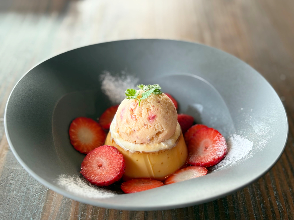 高級苺「女峰」たっぷり。いちごのアイスとカラメルバニラプリンを組み合わせた、期間限定デザートが登場。
