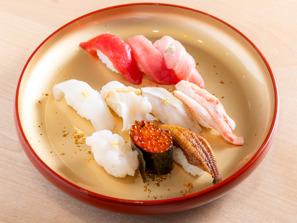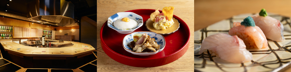 北陸の山海の味覚をふんだんに使った鮨や一品料理をコースで楽しめる店。気さくに客との会話を楽しむ店主は「リラックスして金沢でおいしい食事を楽しんでほしい」という気持ちを大切にしており、店主の人柄に惹かれて通う客も多い。提供するのは昼・夜ともにコース料理一択で、予約が必要。グループ店に人気居酒屋「はち丸」があり、仕入れ量を確保できることが、ハイクオリティな食材を使いながらも手ごろな価格実現の理由のひとつ。鮨のネタは目利きに絶対の自信がある店主が自ら毎朝仕入れ、地元産のコシヒカリをベースに、赤酢と米酢を合わせたシャリとのバランスも秀逸。