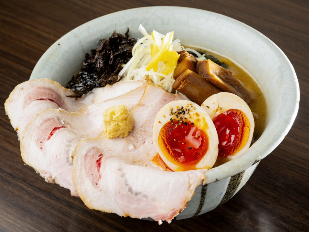 オープン以来、またたく間に県内有数の繁盛店となった味噌ラーメンの専門店。店内はカウンターのみで、並んででもこの店のラーメンを食べたい客が行列を作る。食前に、血糖値の急上昇を抑え、消化吸収を助けるための生姜ジュースがショットグラスで提供されるのはこの店ならではのサービス。人気のラーメンは、強い火力で焼き上げた特注味噌を合わせたスープが中太のちぢれ麺ともよくからむ。口の中でくずれそうなほど柔らかく仕上げた能登豚のチャーシューも美味だ。チャーシューのほか、青ノリ、生姜、柚子などもトッピングされており、食べ進むにつれて味が変化するのも大きな魅力だ。