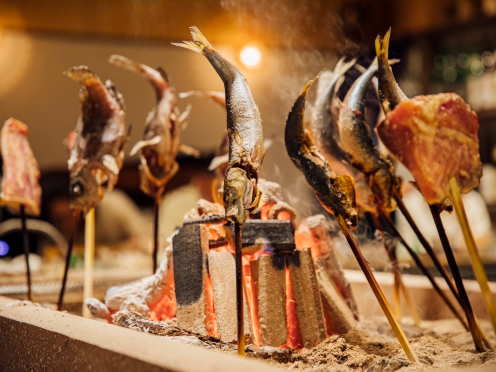 看板メニューの「原始焼き」とは、囲炉裏端で魚を串焼きにする日本古来の調理法なのだそう。余分な水分が飛ぶことで、外はパリッと、中がふっくらと焼き上がり、食材の旨味が凝縮されるんですって♪