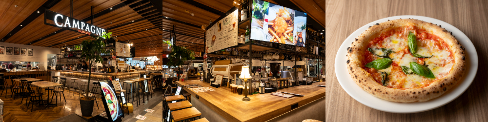 金沢駅のショッピング施設「あんと西」内。多彩なメニューや豊富なドリンクで使い勝手のいい店で、金沢で4店舗展開する人気イタリアンのカンパーニュレストラングループがプロデュースしており、間仕切りのない開放的なスペースに、テーブル席やカウンター席が設けられ、グループでもカップルでもお一人様でもOKだ。朝7時からの営業でモーニングを提供、昼はピザやパスタなどのランチ、カフェタイムには手作りのドルチェを、夜は生のクラフトビールに肉料理やソーセージ、オムライスにパエリアなどもあり、自由に組み合わせが楽しめ、自分好みにカスタマイズができる。