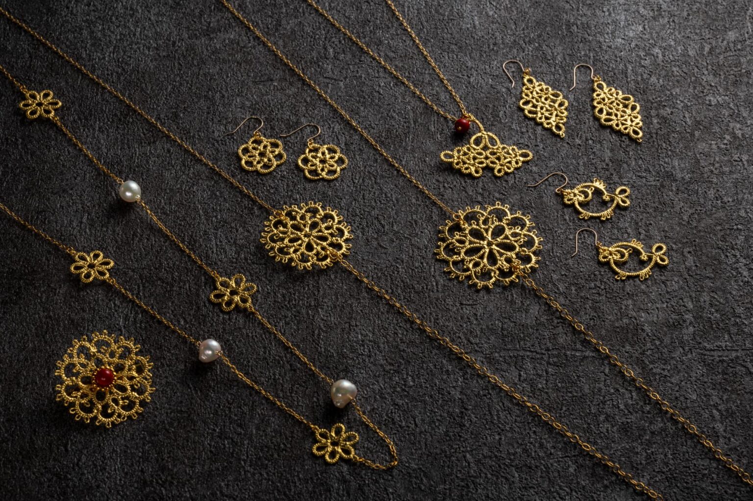 繊細なレースに金箔を重ねた金沢発のアクセサリーブランド「Gold‐Knot(ゴールド・ノット)」。作家の木和田里美さんは、金属アレルギーの自分でも身に付けられるアクセサリーを模索していた際、ヨーロッパ発祥のタティングレースの技法に着目。レースの型崩れを防ぐためにたどり着いたのがアレルギー反応を起こしにくい金箔だった。そこで、金沢が誇る伝統工芸品「金沢箔」を絹糸のレースに何層も重ね貼りする独自技法(特許取得)を開発。数年にわたる試行錯誤を経て完成した。Gold‐Knotでは「伝統工芸を日常に身につける」をテーマに、ネックレスやピアス、ブローチなど多彩なアイテムを展開。