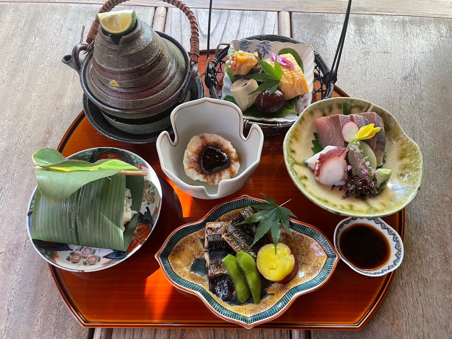 1830年創業の老舗料亭『大友楼』では、美しい日本庭園を眺めながら、五感で楽しむ料理を提供している。歴史ある茶室「一井庵」は2020年から一般公開され、地元の人々や観光客にも人気。要予約の「半月御膳」では、秋の味覚をふんだんに取り入れた「鱧と松茸の土瓶蒸し」や「さんま柚庵焼」、「栗ご飯」が堪能できる。季節感あふれる「和アフタヌーンティーセット」も人気で、90分のドリンクおかわり自由の完全予約制。