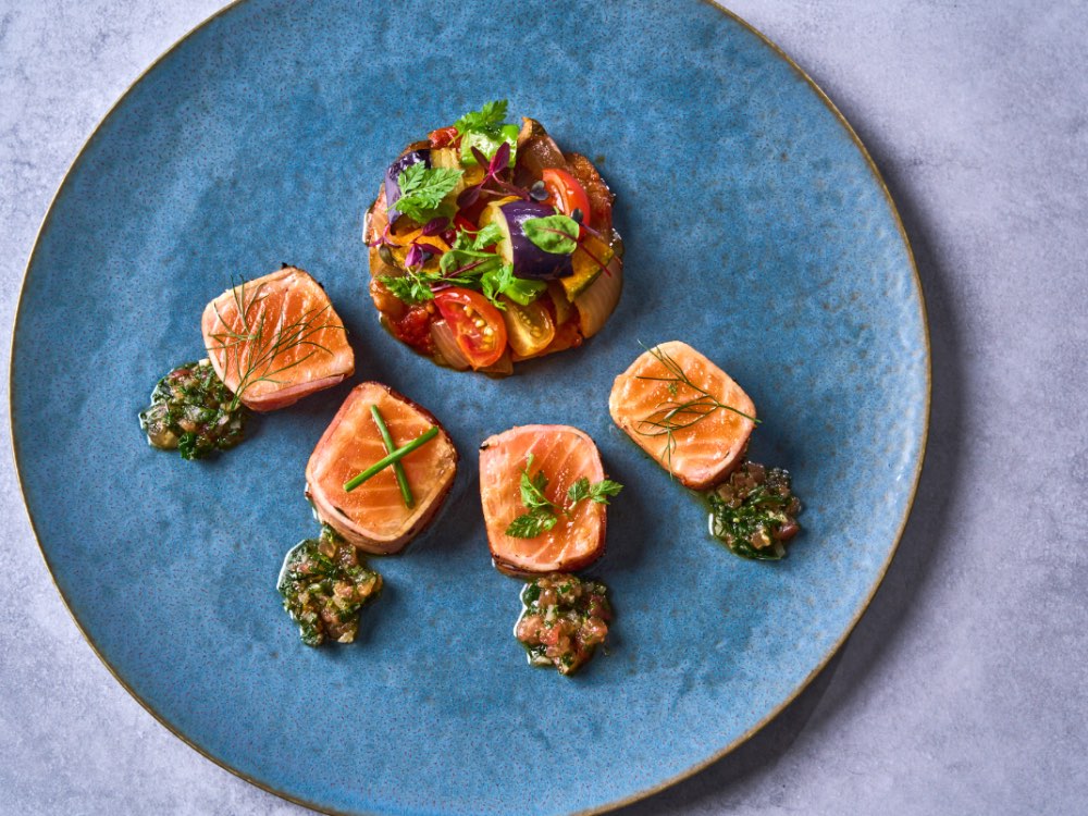 【サーモンのベーコン巻き ソースヴェルジュ ラタトゥイユ添え】1,800円(税込)
