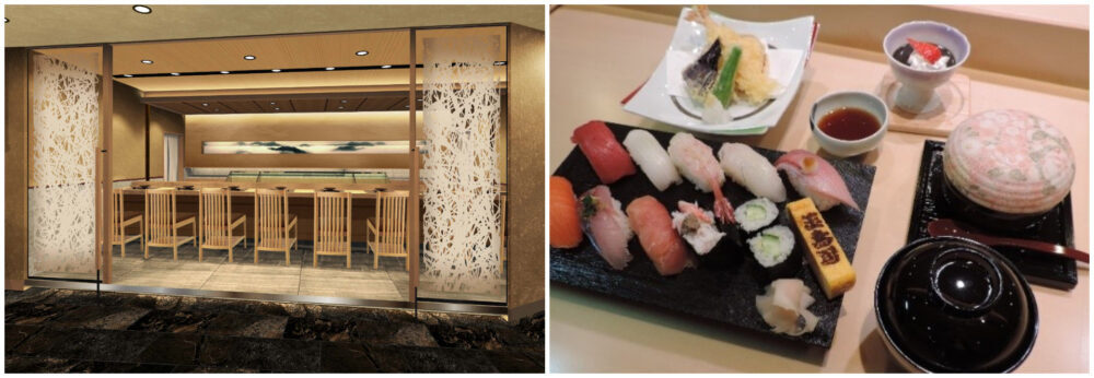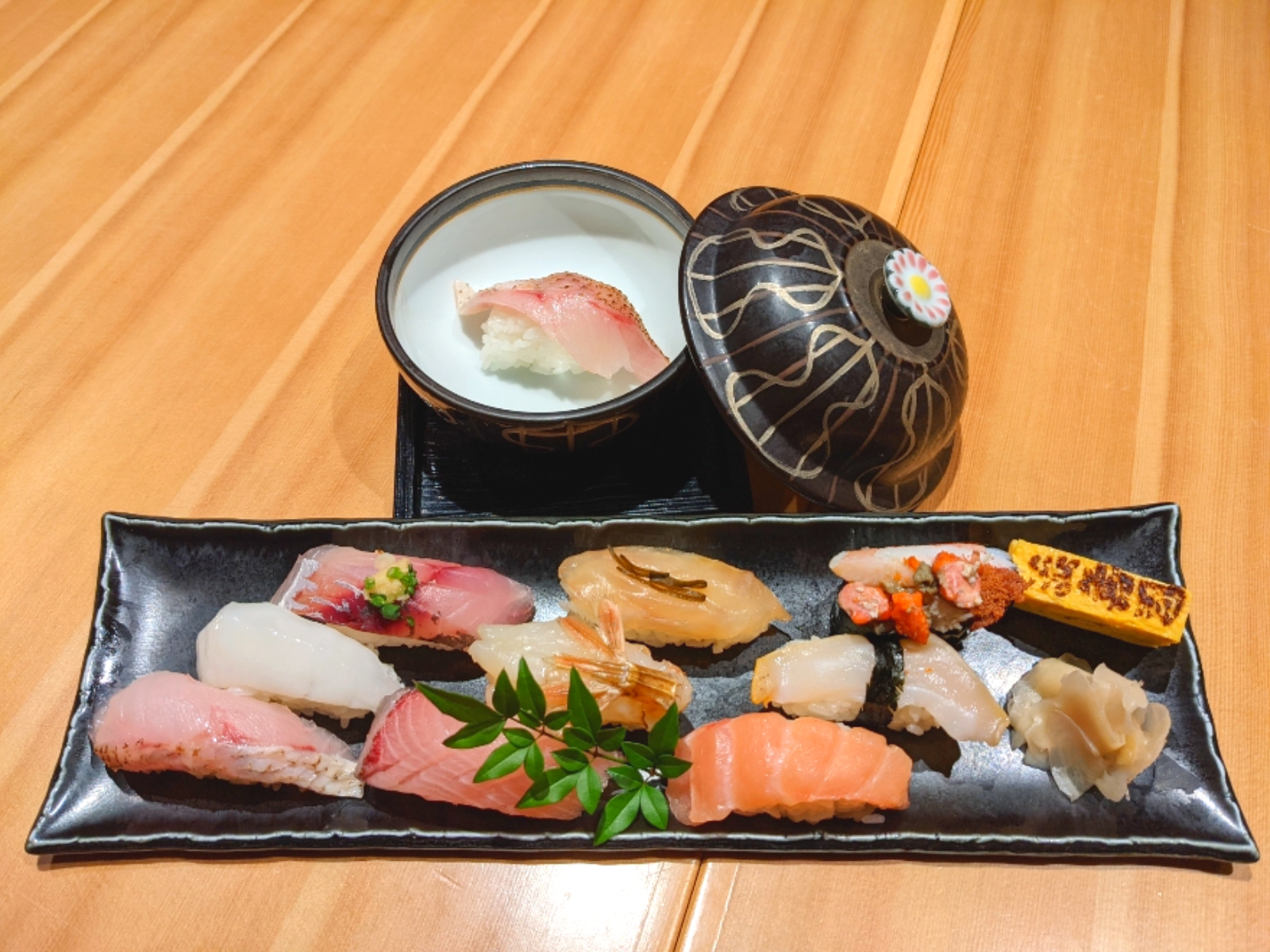左/写真はカウンター席。この他にテーブル席もある。右/ランチメニュー「犀川」(2,750円)。旬のネタを握った寿司9貫と巻物、茶碗蒸し、揚げ物、お椀、デザートのセット。