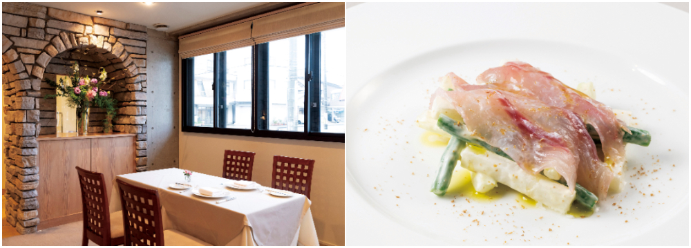 左/季節の生花が店内に彩を添える。柔らかく落ち着いたトーンが優しい印象。穏やかな時間が流れる。右/料理の一例。柳八目のマリネにフレンチマスタードソースで和えたセロリ、インゲン豆、カブを添えて。